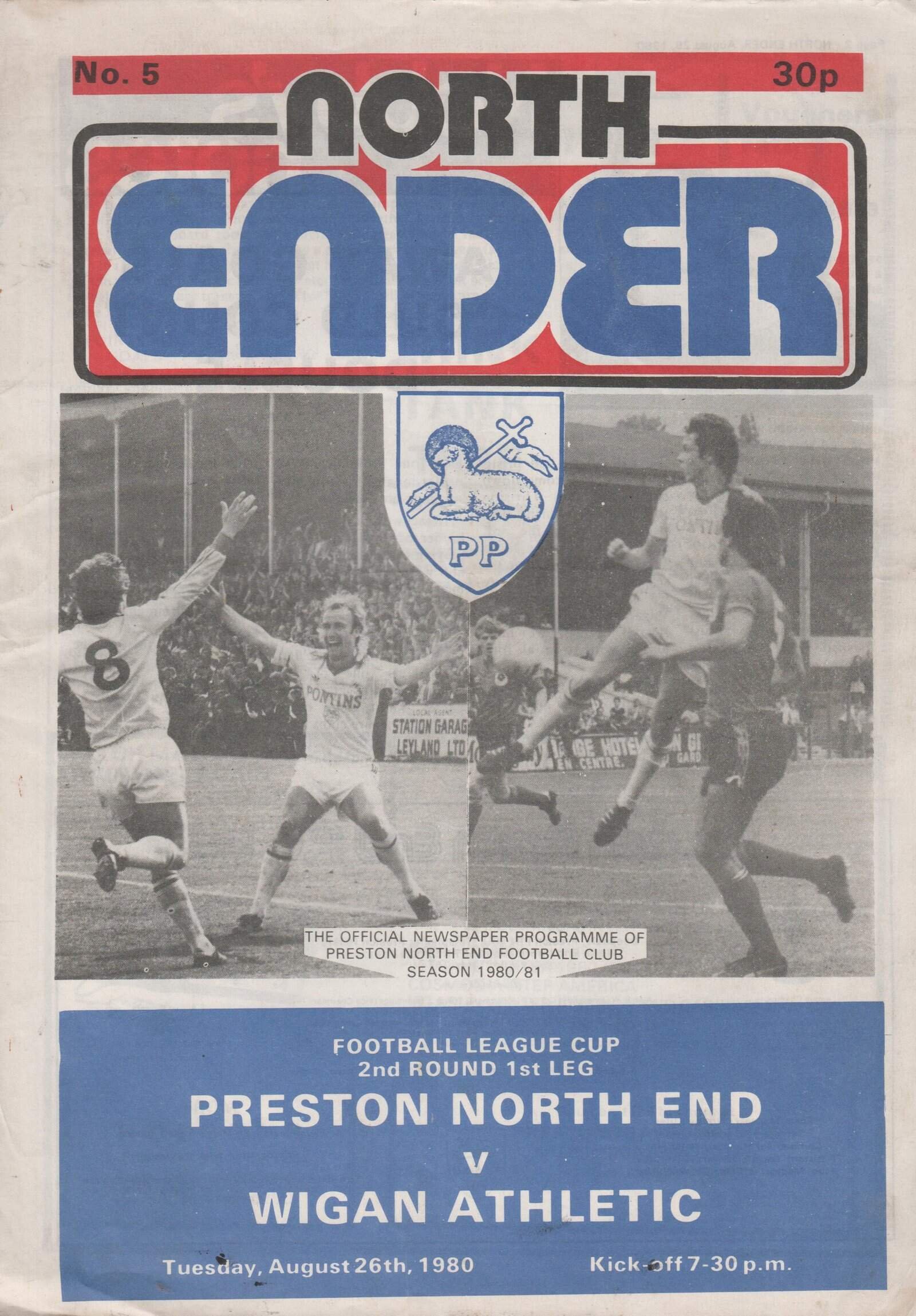 Match: Preston North End v Wigan Athletic Competition: League Cup 2nd Round 1st leg Date: 26-Aug-1980 Comments: Newspaper tabloid issue Rating: 3 Condition: Marks on front and back, scuffs along edges Weight in grams: 80