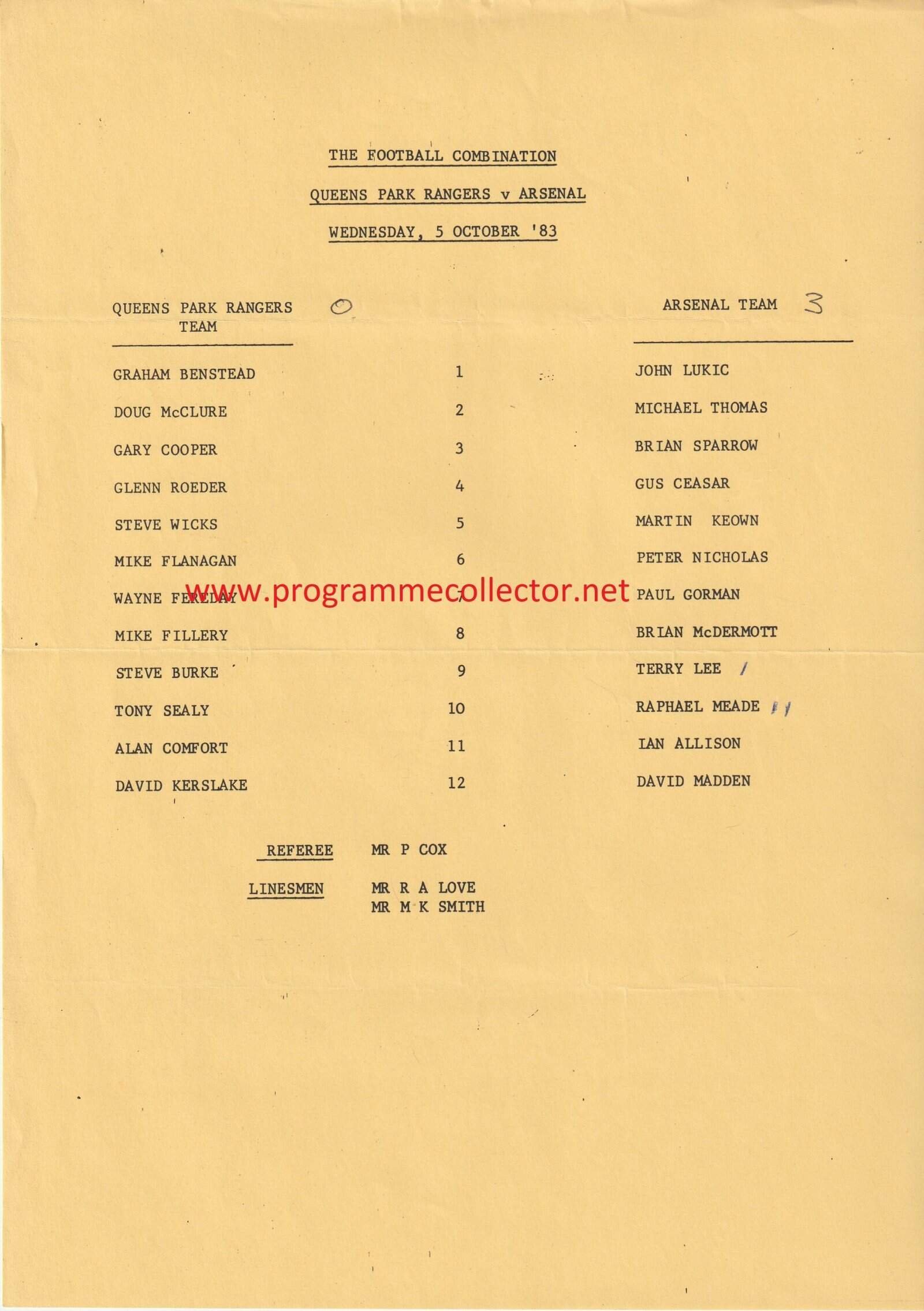 Match: Queens Park Rangers Reserves v Arsenal Reserves Competition: Football Combination Date: 05-Oct-1983 Comments: Single sheet Rating: 3 Condition: Team changes Weight in grams: 20