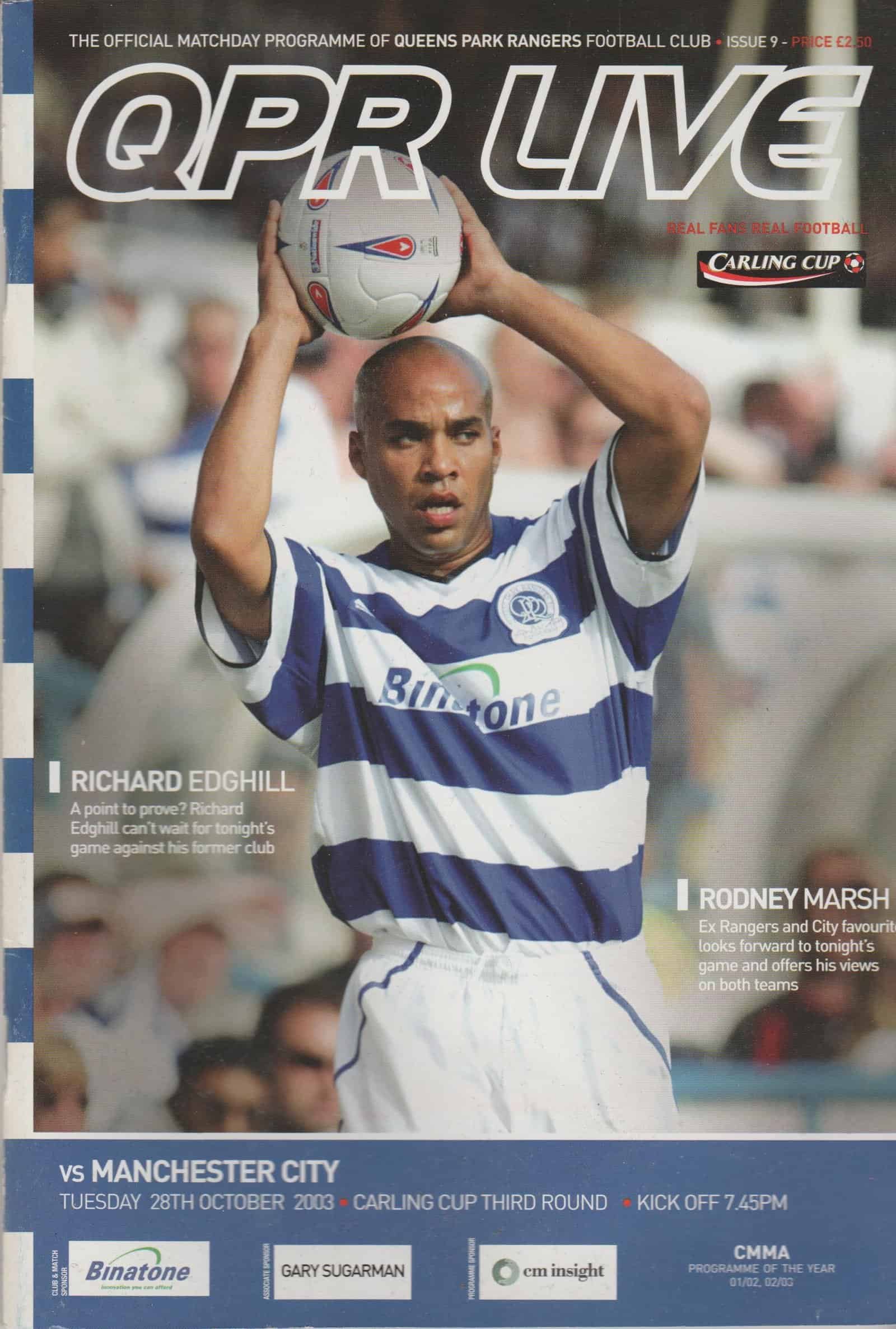 Match: Queens Park Rangers v Manchester City Competition: Carling Cup 3rd Round Date: 28-Oct-2003 Comments: Rating: 4 Condition: Very good Weight in grams: 140