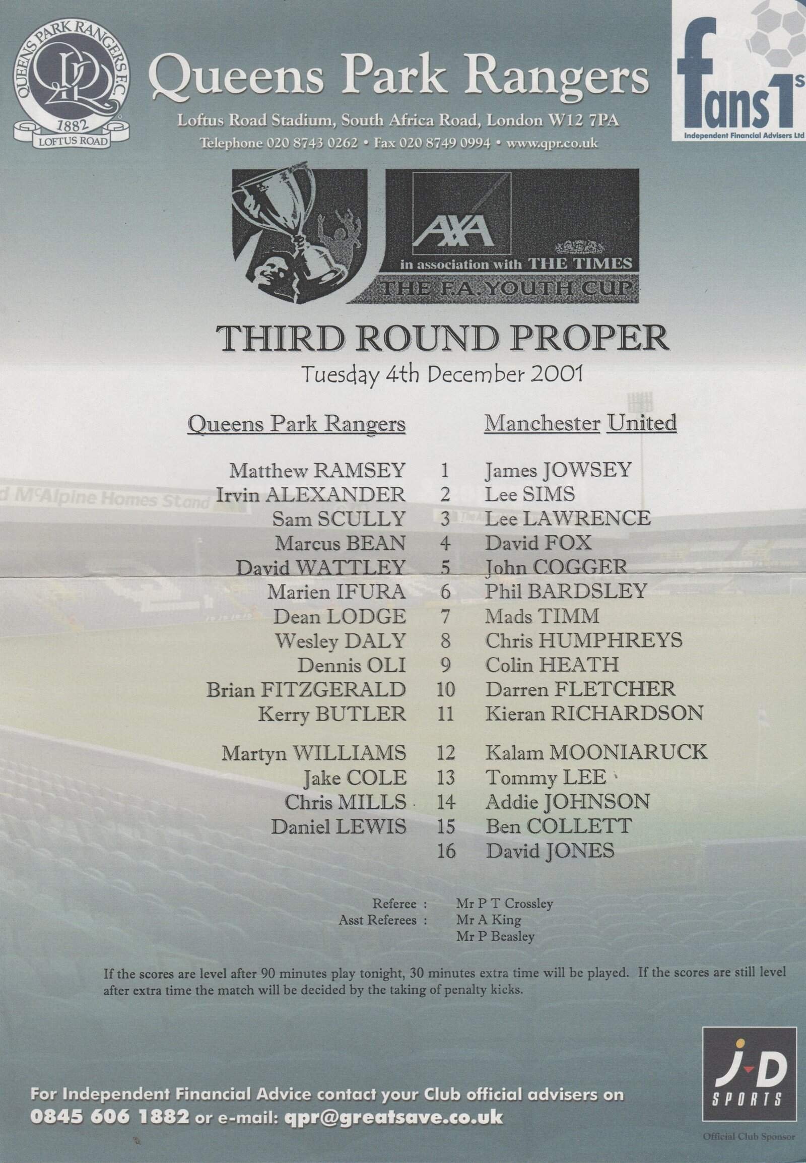 Match: Queens Park Rangers v Manchester United Competition: FA Youth Cup 3rd Round Date: 04-Dec-2001 Comments: Single sheet Rating: 4 Condition: Very good Weight in grams: 20