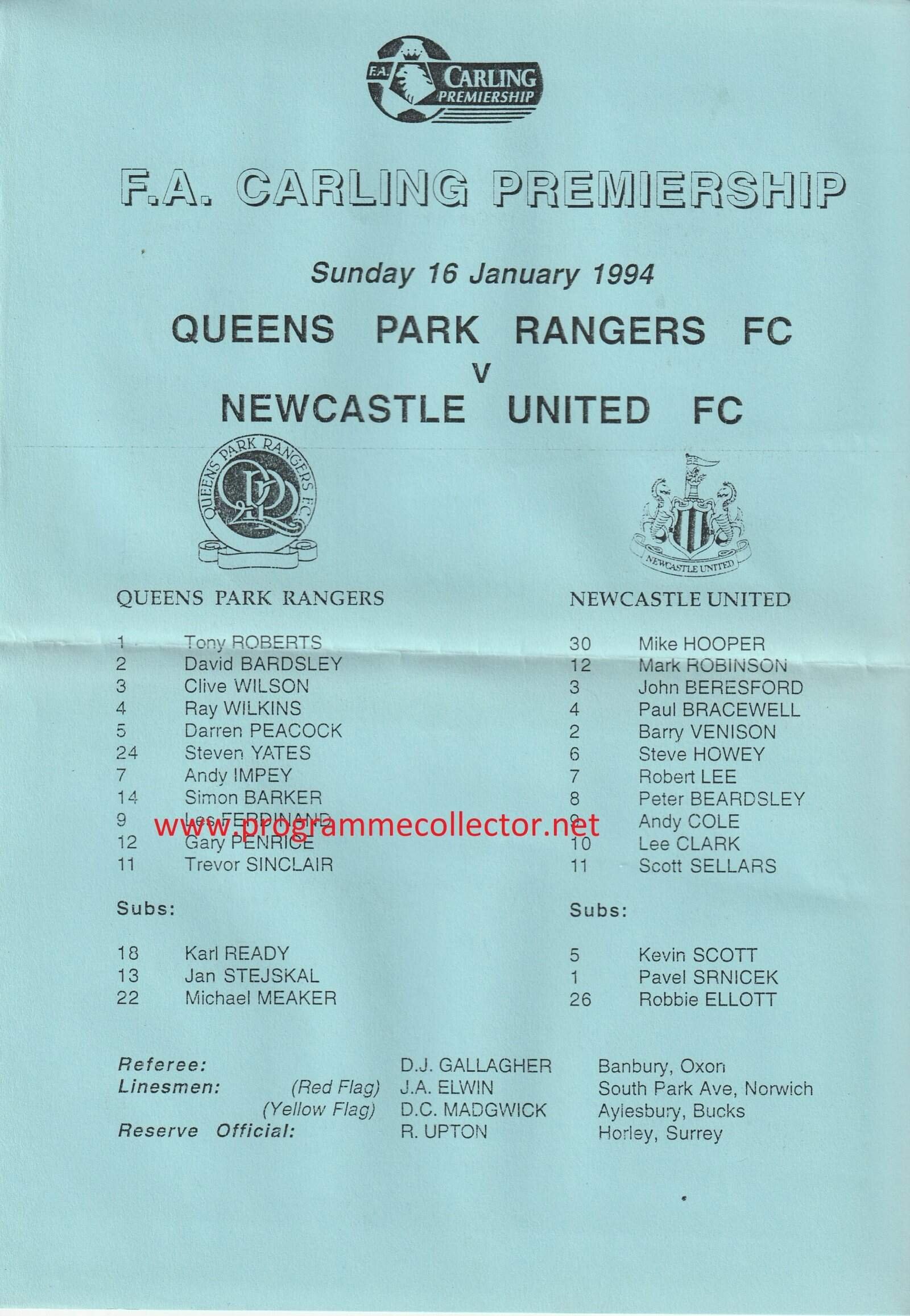 Match: Queens Park Rangers v Newcastle United Competition: Premier League Date: 16-Jan-1994 Comments: Rating: 3 Condition: Fold Weight in grams: 10