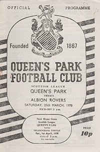 Match: Queens Park v Albion Rovers Competition: Scottish Division 2 Date: 25-03-1978 Comments: Rating: 4 Condition: Price and initials pencil in top corner, slight rust marks on cover Weight in grams: 40