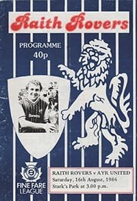 Match: Raith Rovers v Ayr United Competition: Scottish League Division 2 Date: 16-08-1986 Comments: Rating: 3 Condition: Fold, team changes, slight print blemishes on cover Weight in grams: 60