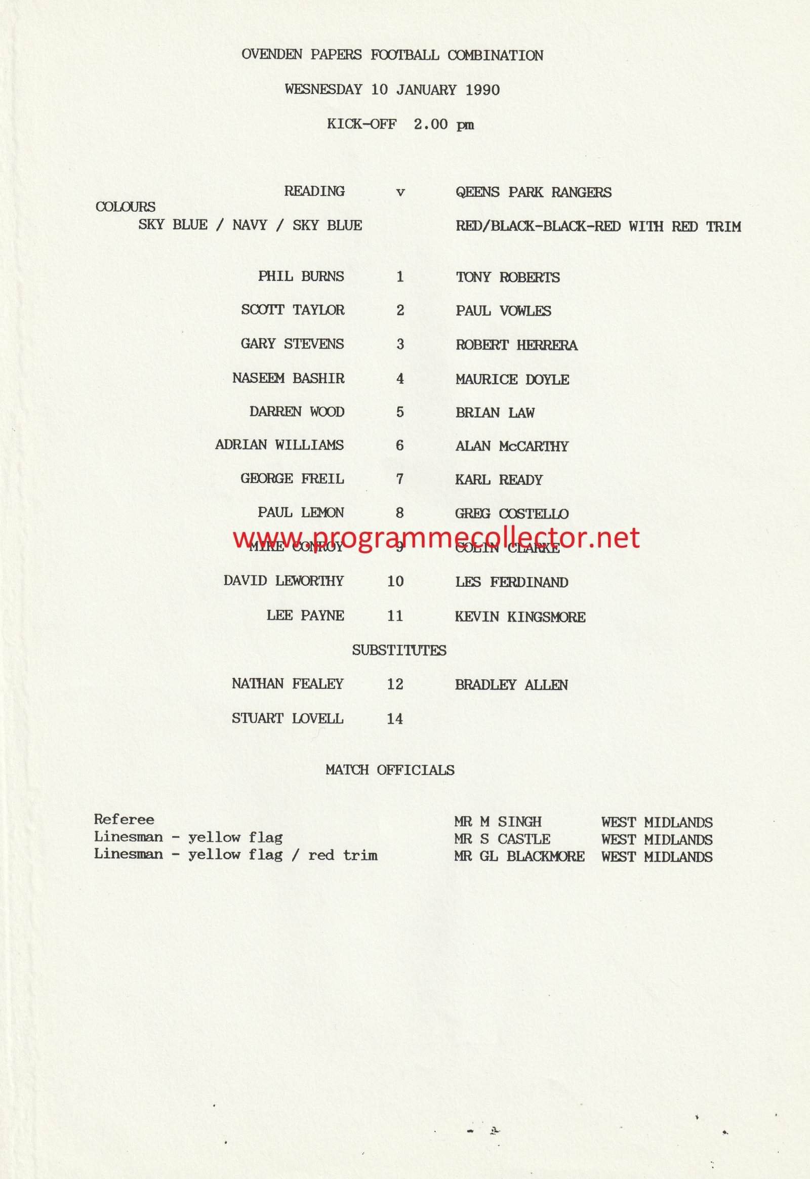 Match: Reading Reserves v Queens Park Rangers Reserves Competition: Football Combination Date: 10-Jan-1990 Comments: Single sheet issue Rating: 4 Condition: Very good Weight in grams: 20