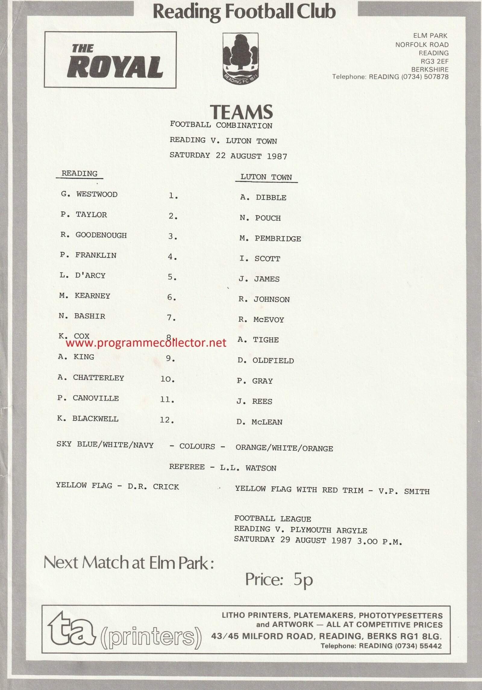 Reading Reserves v Luton Town Reserves 22-Aug-1987