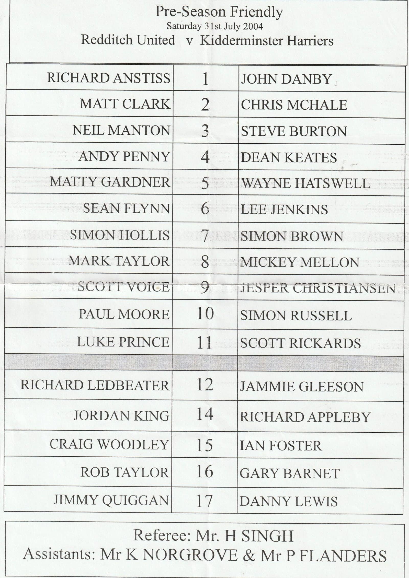 Match: Redditch United v Kidderminster Harriers Competition: Friendly Date: 31-Jul-2004 Comments: Single sheet issue Rating: 3 Condition: Fold Weight in grams: 20