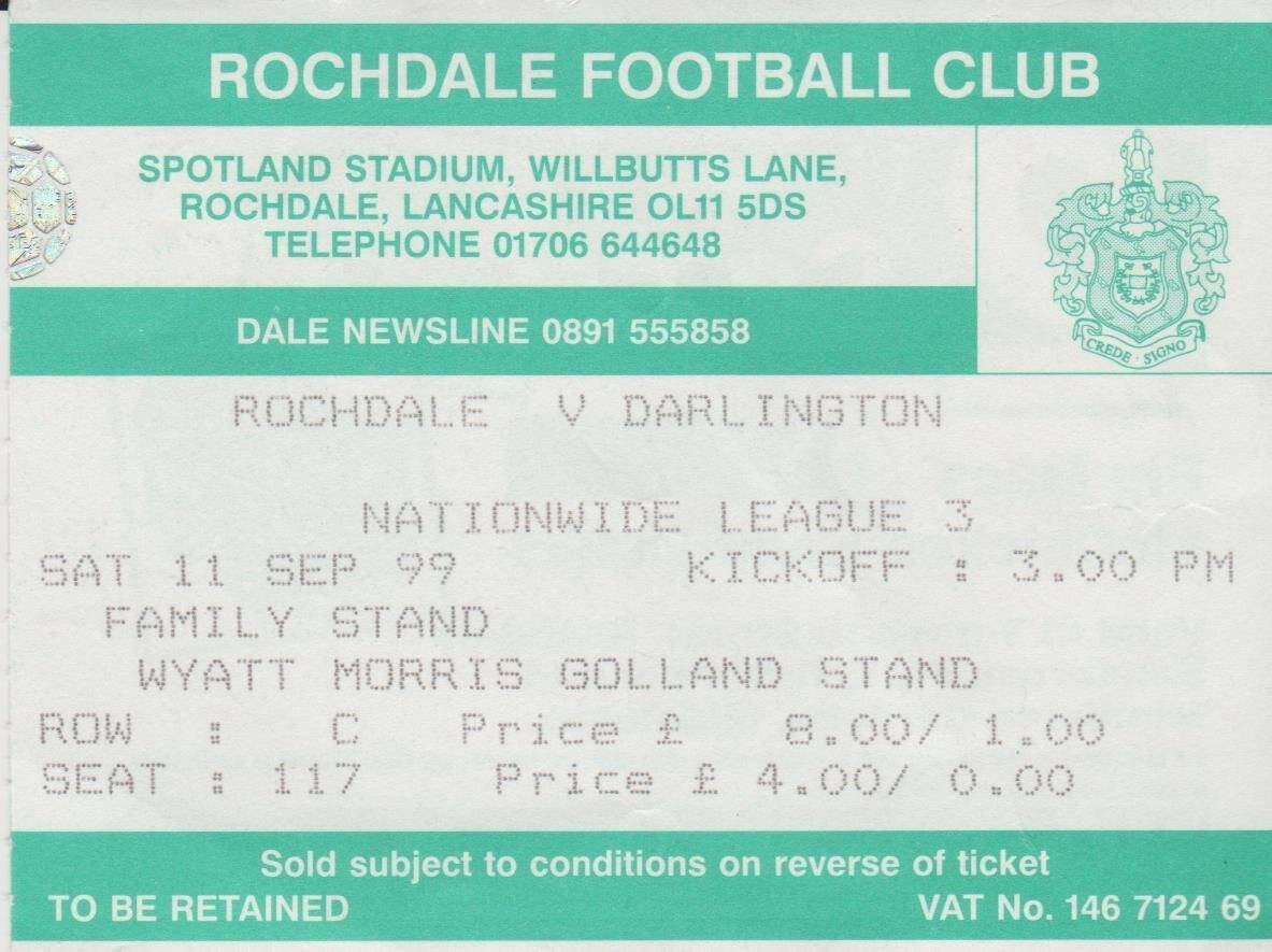 Match: Rochdale v Darlington Competition: Nationwide League Division 3 Date: 11-Sep-1999 Comments: Rating: 3 Condition: Fold Weight in grams: 10