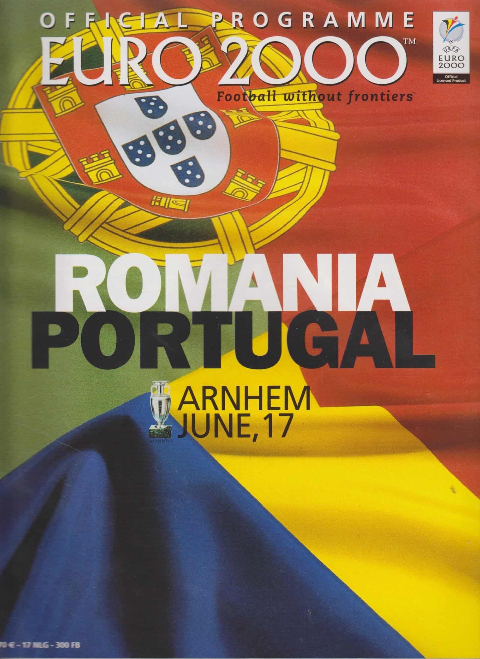 Match: Romania v Portugal Competition: European Championships Final Stages Group A Date: 17-Jun-2000 Comments: Rating: 4 Condition: Very good Weight in grams: 400
