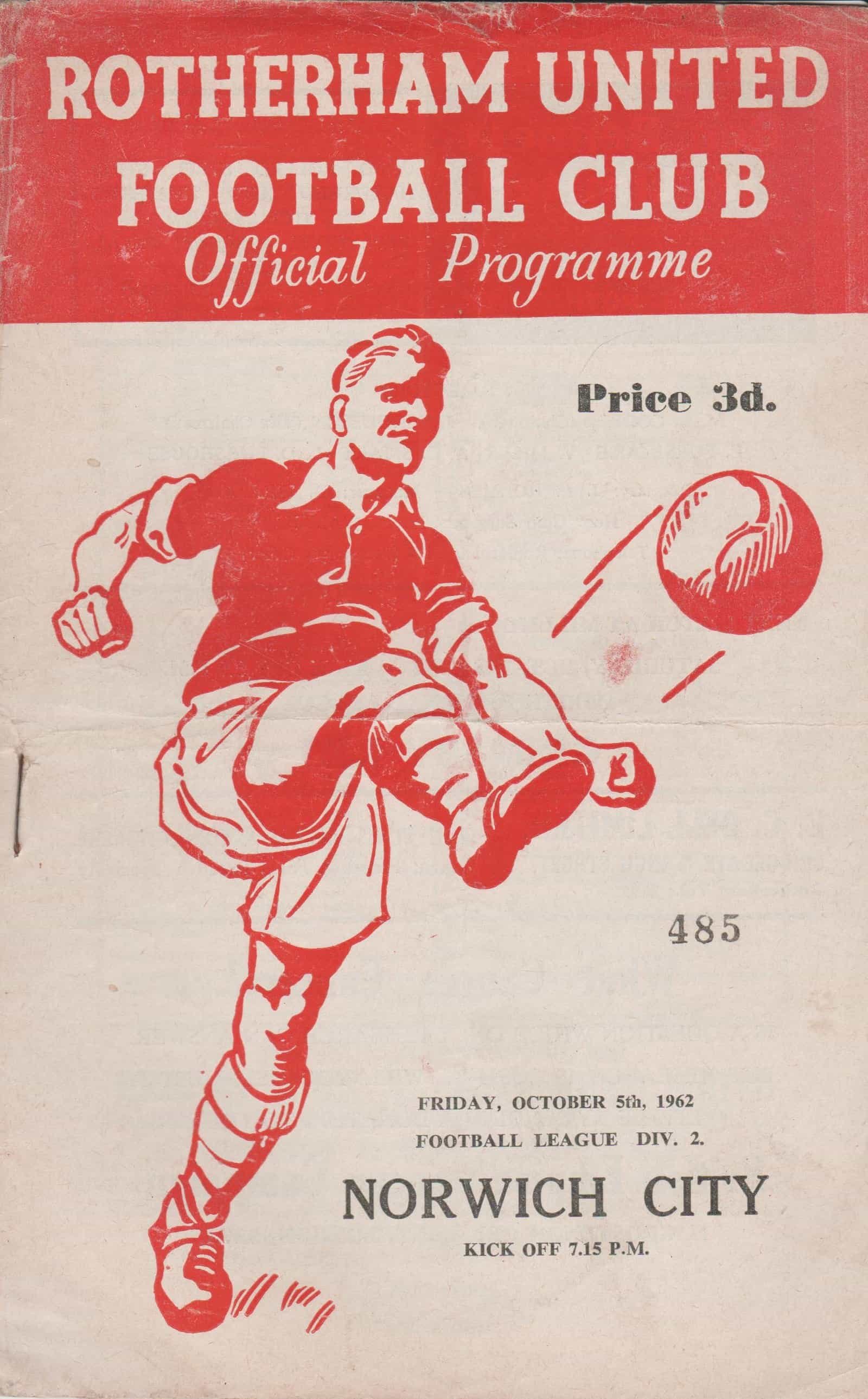 Match: Rotherham United v Norwich City Competition: League Division 2 Date: 05-Oct-1962 Comments: Rating: 4 Condition: Creases, writing inside Weight in grams: 40