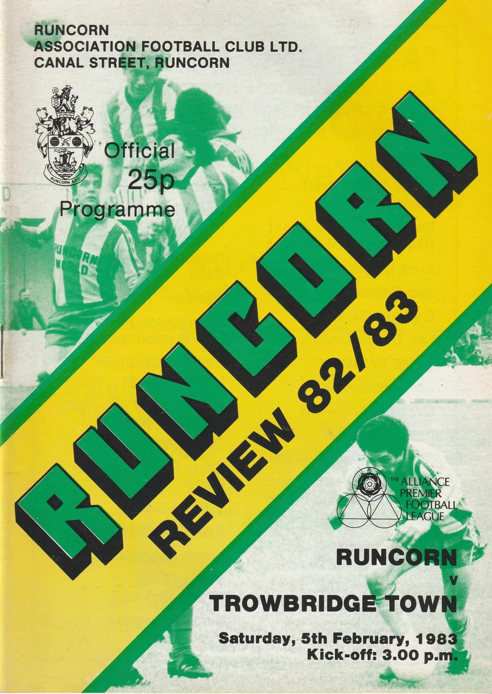 Match: Runcorn v Trowbridge Town Competition: Alliance Premier League Date: 05-Feb-1983 Comments: Rating: 4 Condition: Very good Weight in grams: 100