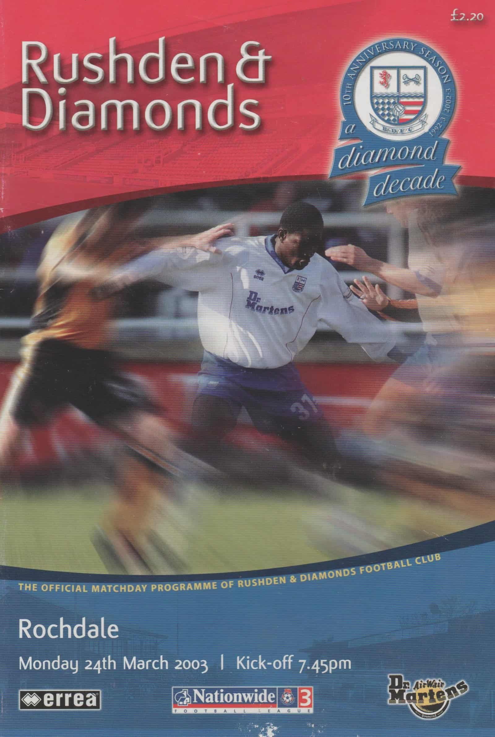 Match: Rushden & Diamonds v Rochdale Competition: League 2 Date: 24-Mar-2003 Comments: Rating: 3 Condition: Slight mark on bottom edge of cover Weight in grams: 160