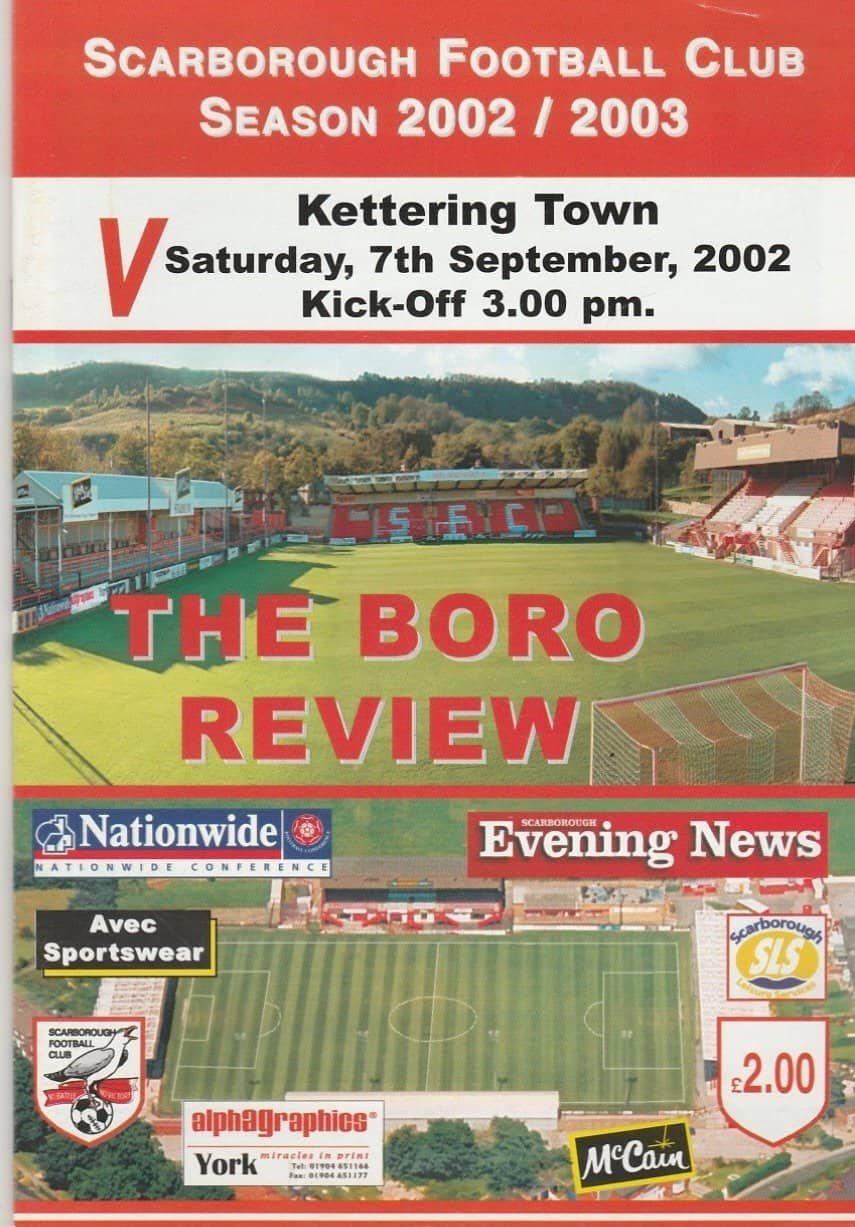 Match: Scarborough v Kettering Town Competition: Nationwide Conference Date: 07-Sep-2002 Comments: Rating: 4 Condition: Very good Weight in grams: 100