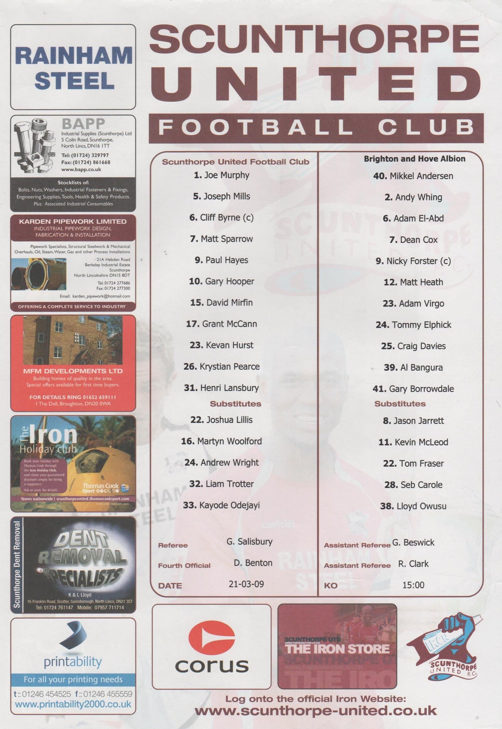 Match: Scunthorpe United v Brighton & Hove Albion Competition: League 1 Date: 21-Mar-2009 Comments: Rating: 4 Condition: Very good Weight in grams: 20