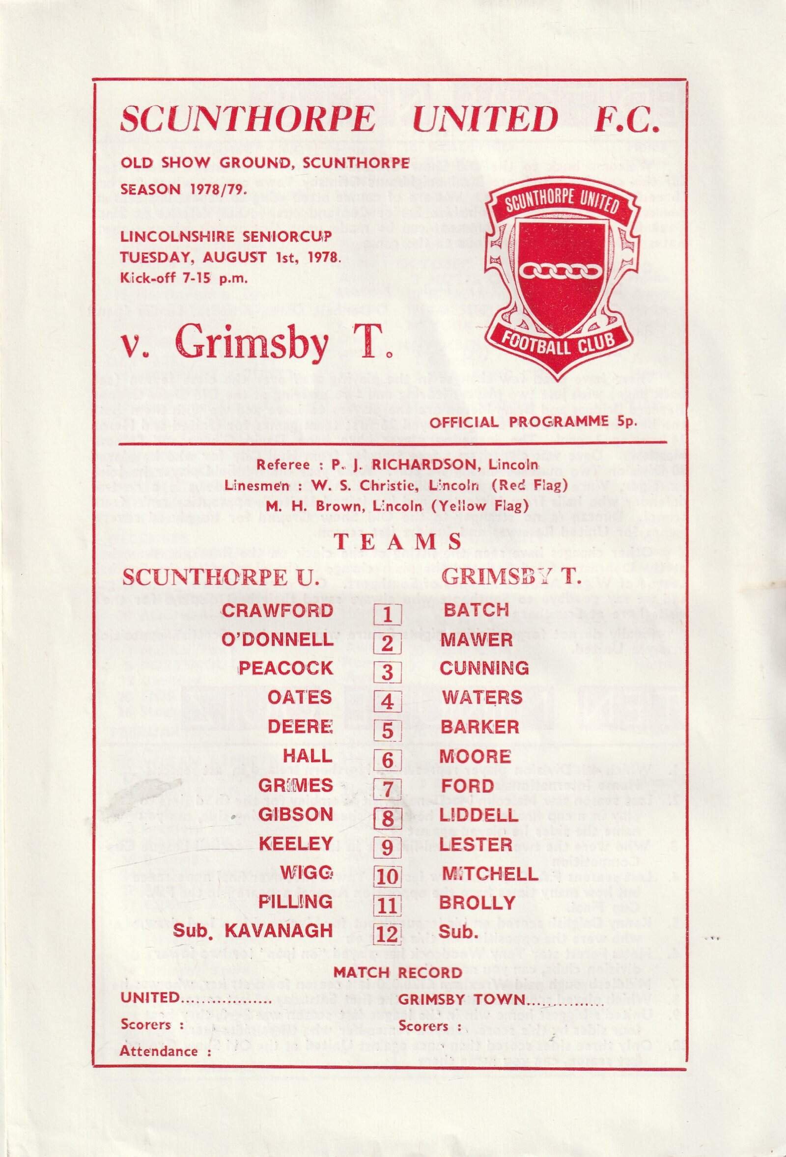 Match: Scunthorpe United v Grimsby Town Competition: Lincolnshire Senior Cup Date: 01-Aug-1978 Comments: 4 page issue Rating: 3 Condition: Curved edges Weight in grams: 60