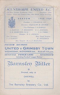 Match: Scunthorpe United v Grimsby Town Competition: League Division 3 Date: 06-11-1968 Comments: Rating: 3 Condition: Water stain throughout Weight in grams: 40
