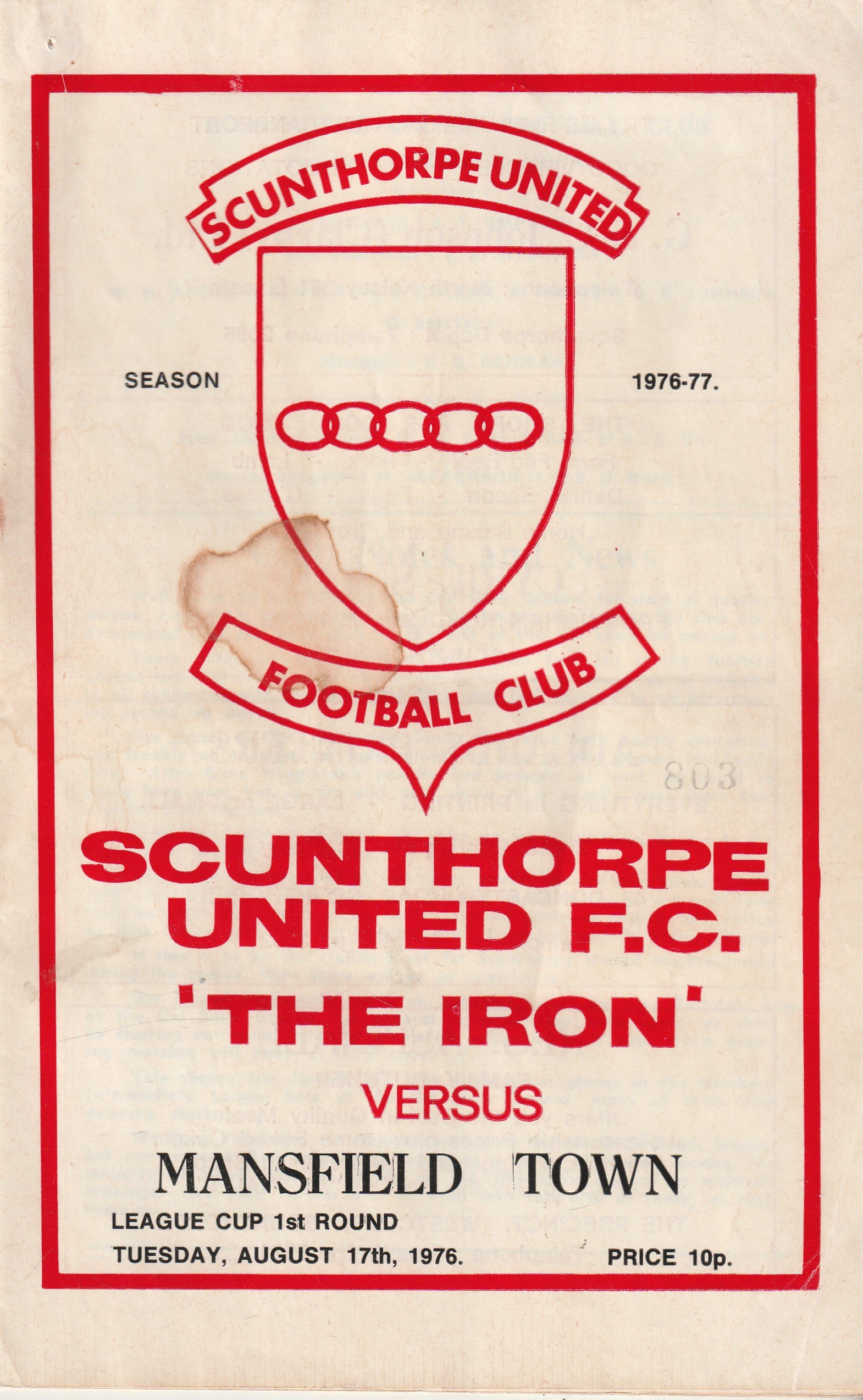 Match: Scunthorpe United v Mansfield Town Competition: League Cup 1st Round Date: 17-Aug-1976 Comments: Rating: 3 Condition: Folds, pin hole, stain on cover, rusty staple Weight in grams: 80