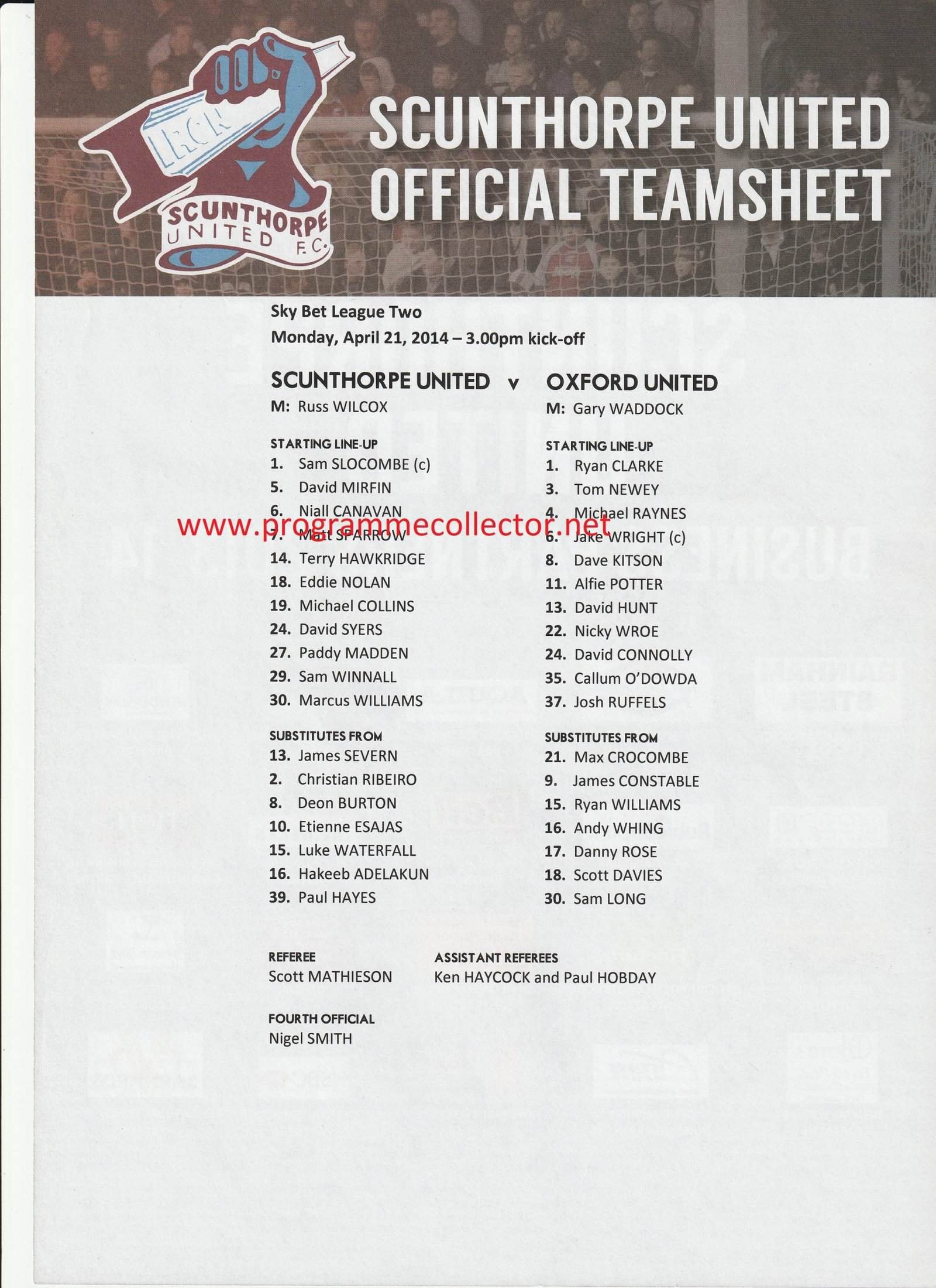 Match: Scunthorpe United v Oxford United Competition: League 2 Date: 21-Apr-2014 Comments: Rating: 4 Condition: Very good Weight in grams: 20