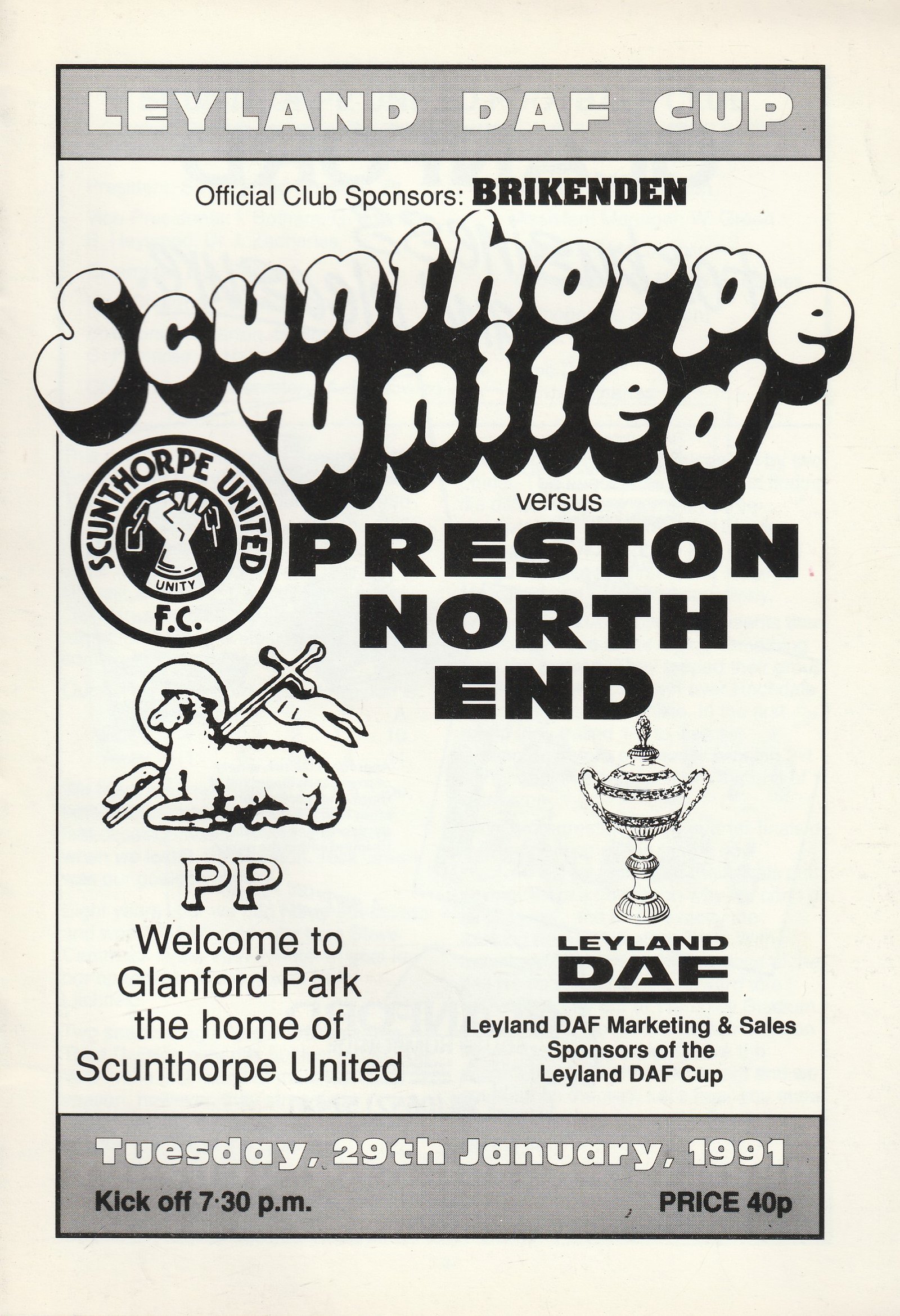 Match: Scunthorpe United v Preston North End Competition: Leyland DAF Trophy Quarter Final Date: 29-Jan-1991 Comments: Rating: 4 Condition: Very good Weight in grams: 80