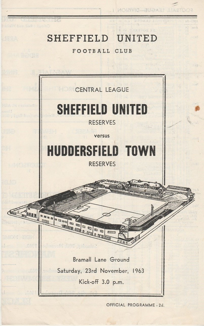 Match: Sheffield United Reserves v Huddersfield Town Reserves Competition: Central League Date: 23-Nov-1963 Comments: 4 page issue Rating: 4 Condition: Small mark on cover Weight in grams: 20