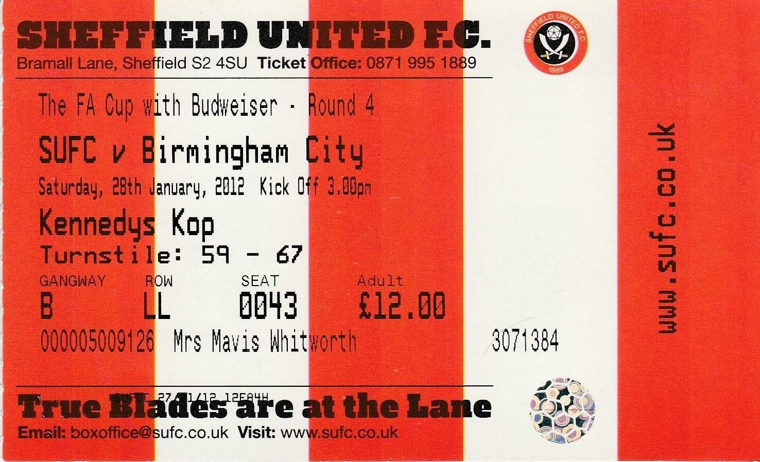 Match: Sheffield United v Birmingham City Competition: FA Cup 4th Round Date: 28-Jan-2012 Comments: Rating: 4 Condition: Very good Weight in grams: 20