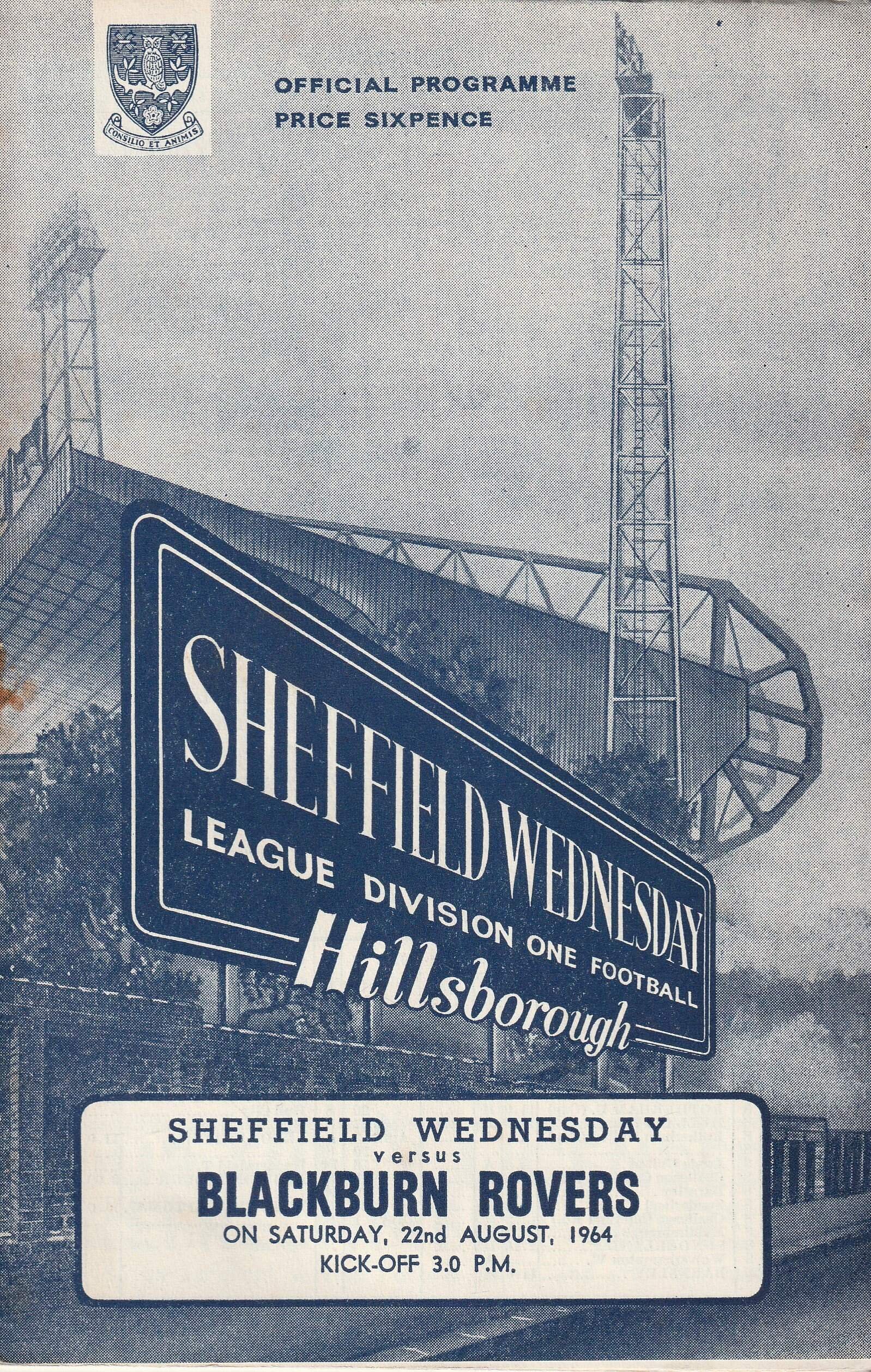 Match: Sheffield Wednesday v Blackburn Rovers Competition: League Division 1 Date: 22-Aug-1964 Comments: Rating: 3 Condition: Hole on spine where staple has been removed, bleed marks Weight in grams: 60
