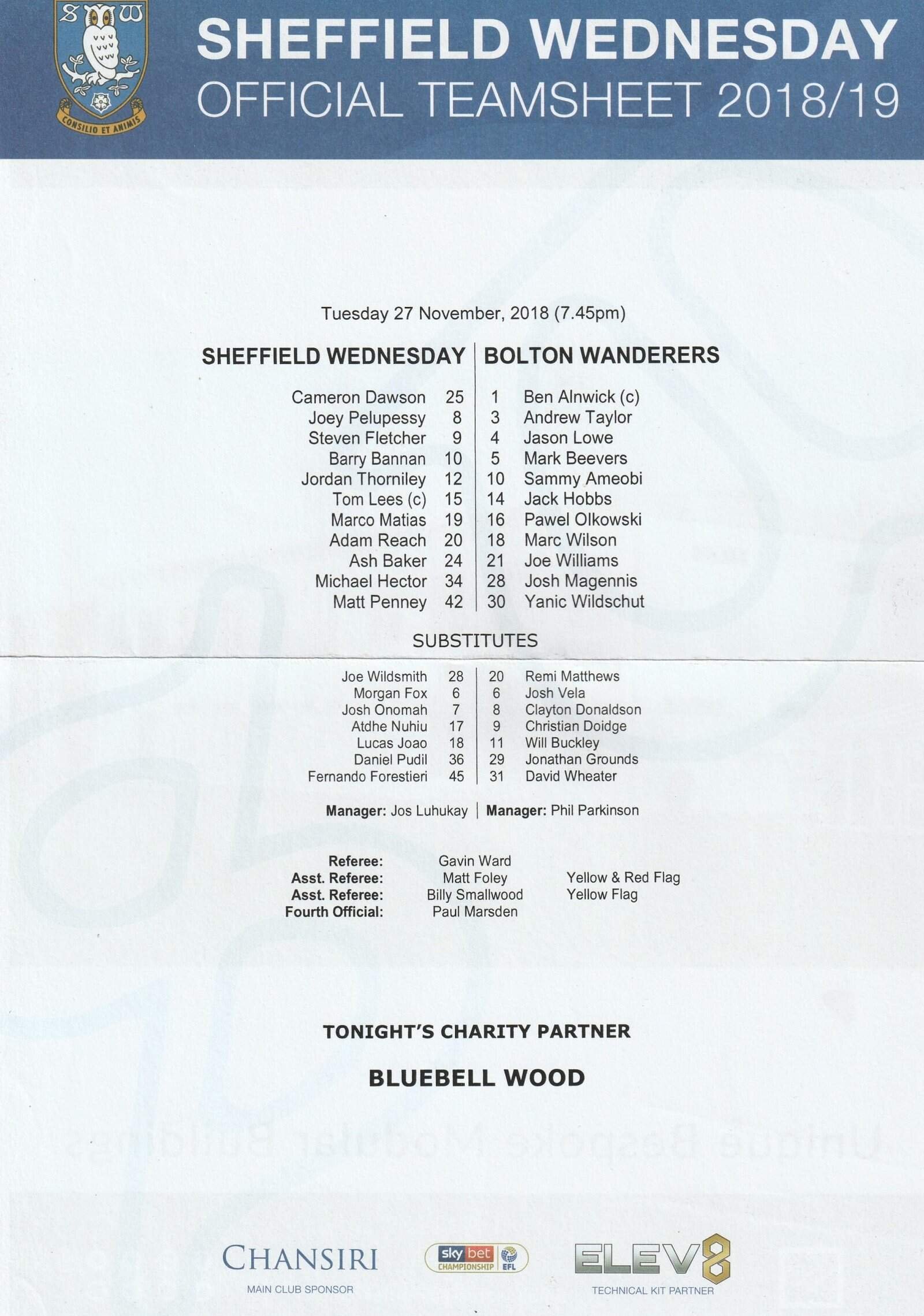 Match: Sheffield Wednesday v Bolton Wanderers Competition: League Championship Date: 27-Nov-2018 Comments: Rating: 4 Condition: Fold Weight in grams: 20