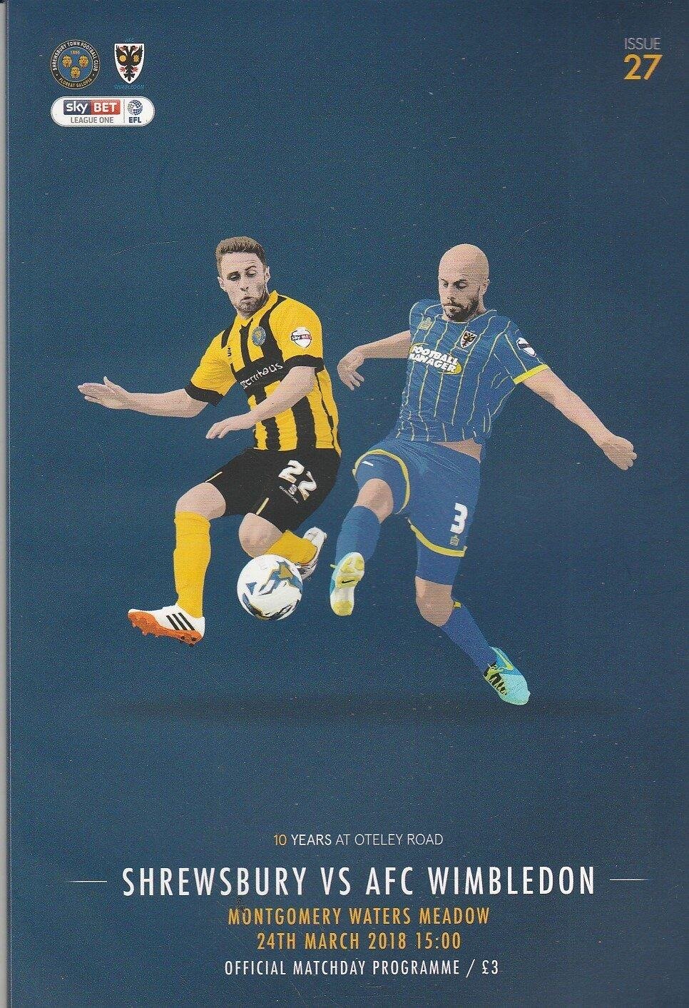 Match: Shrewsbury Town v AFC Wimbledon Competition: League 1 Date: 24-Mar-2018 Comments: Rating: 4 Condition: Very good Weight in grams: 200