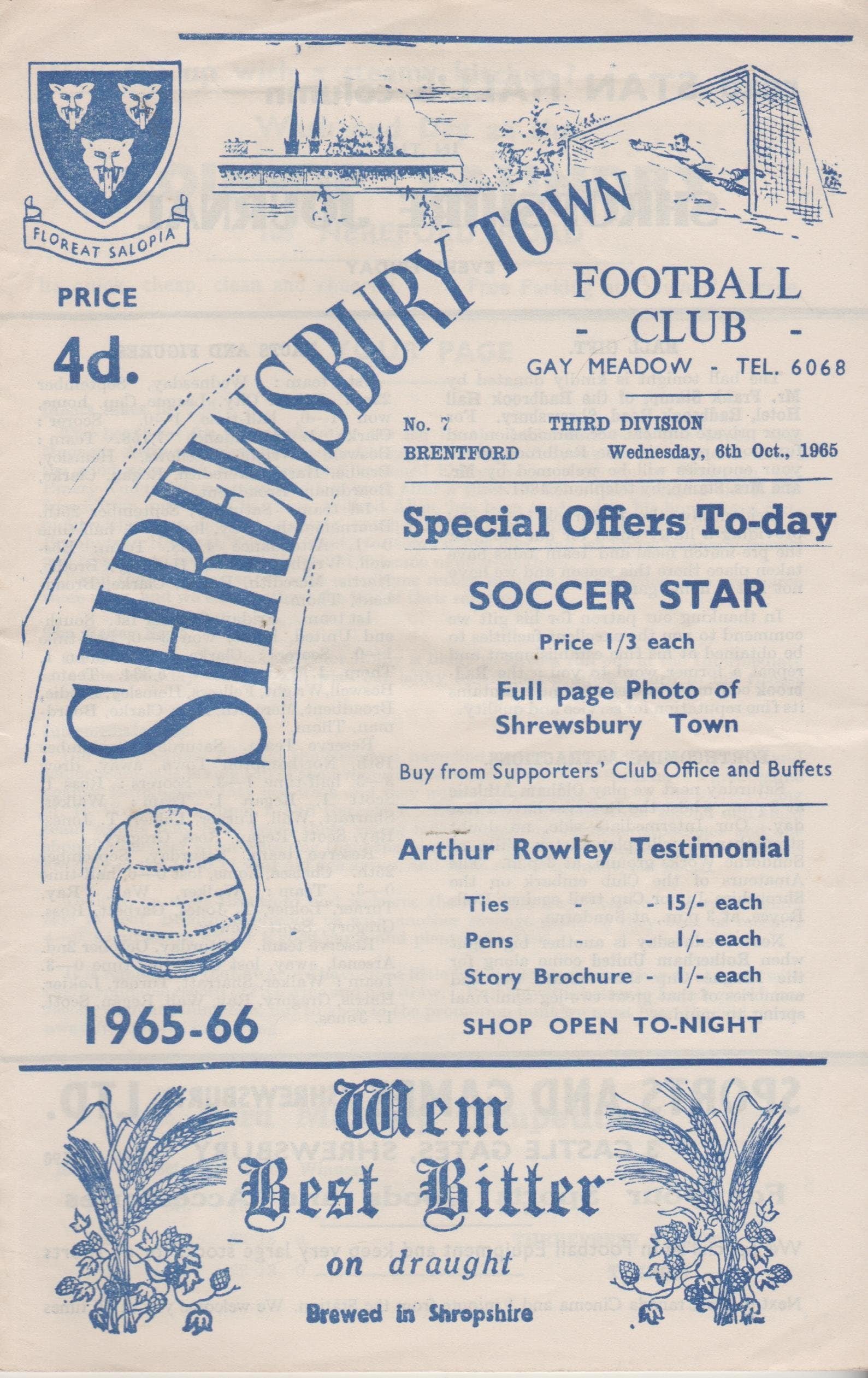 Match: Shrewsbury Town v Brentford Competition: League Division 3 Date: 06-Oct-1965 Comments: Rating: 4 Condition: Very good Weight in grams: 60