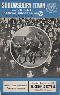 Match: Shrewsbury Town v Brighton and Hove Albion Competition: League Division 3 Date: 11-10-1969 Comments: Rating: 3 Condition: Small tear on bottom of spine, light corner creases Weight in grams: 80