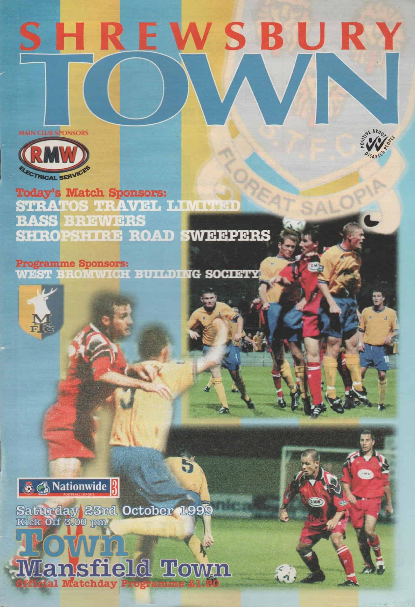 Match: Shrewsbury Town v Mansfield Town Competition: League Division 3 Date: 23-Oct-1999 Comments: Rating: 4 Condition: Very good Weight in grams: 80