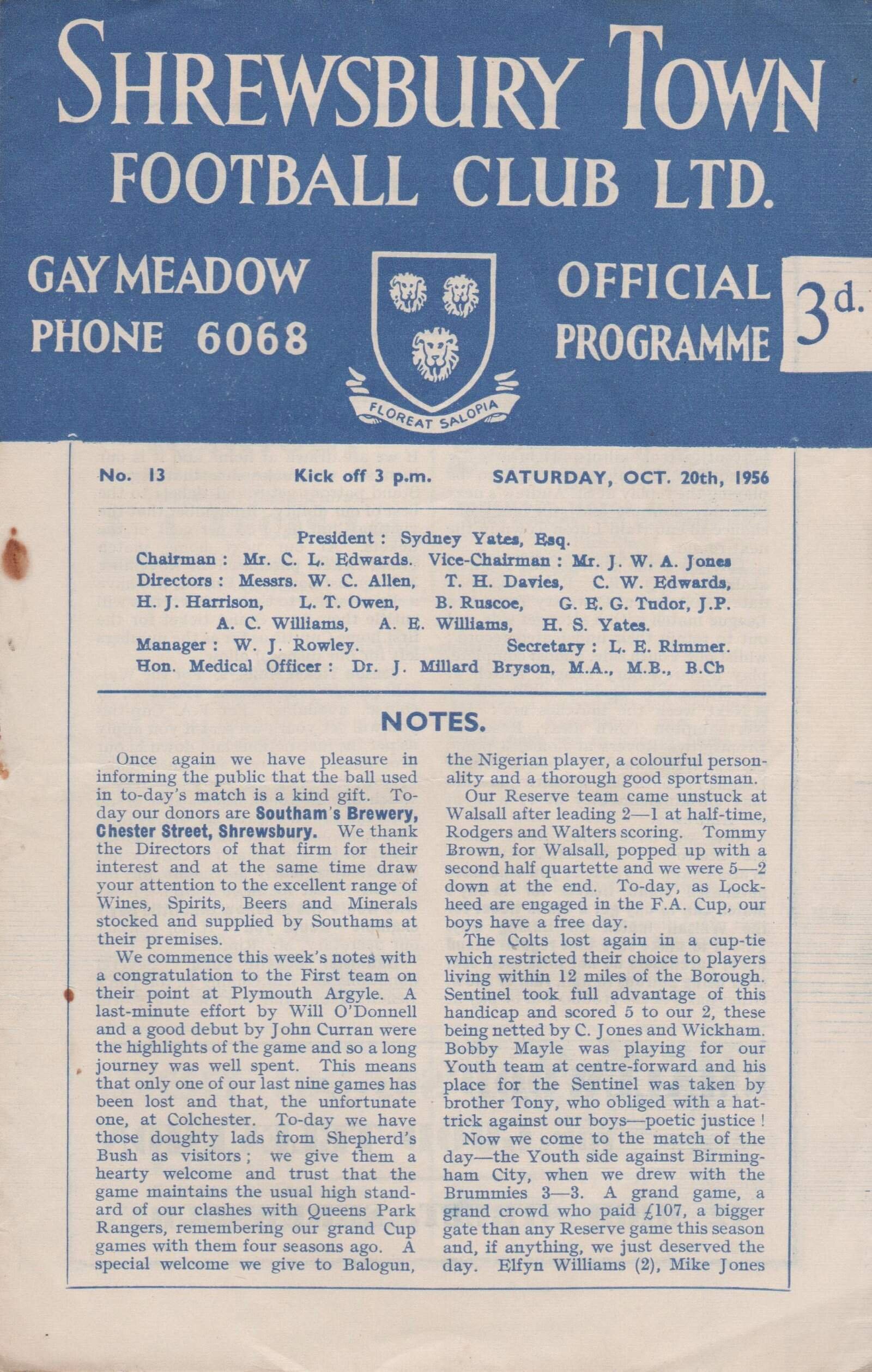 Match: Shrewsbury Town v Queens Park Rangers Competition: League Division 3 South Date: 20-Oct-1956 Comments: Rating: 3 Condition: Rusty staples, staple bleed, centre fold loose, slight fold Weight in grams: 40