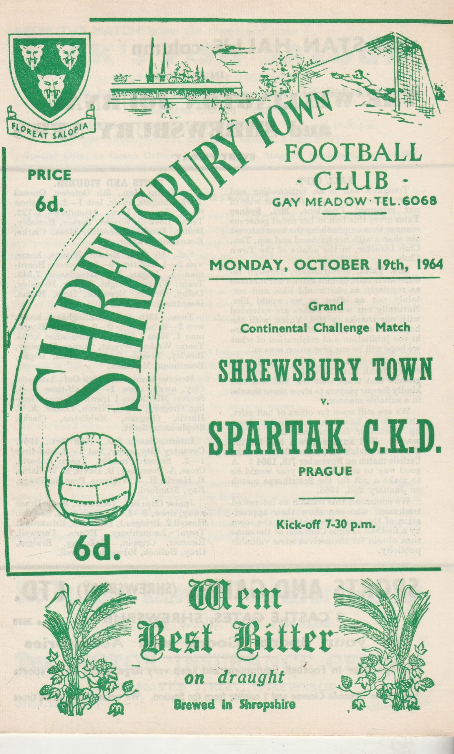 Match: Shrewsbury Town v Spartak Prague Competition: Friendly Date: 19-Oct-1964 Comments: Rating: 4 Condition: Very good Weight in grams: 60