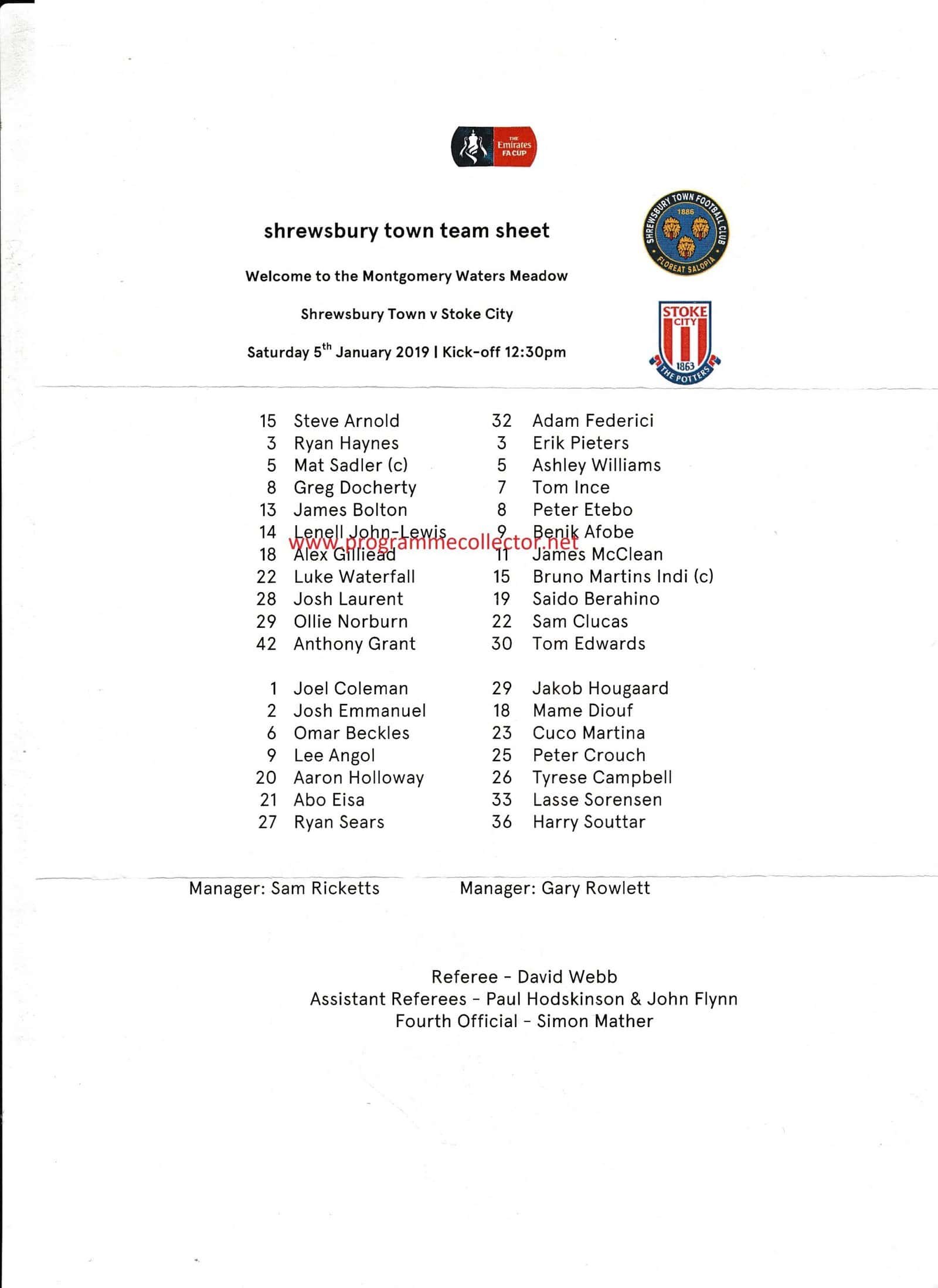 Match: Shrewsbury Town v Stoke City Competition: FA Cup 3rd Round Date: 05-Jan-2019 Comments: Rating: 3 Condition: Folds Weight in grams: 20