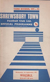 Match: Shrewsbury Town v Walsall Competition: League Division 3 Date: 01-09-1971 Comments: Rating: 4 Condition: Slight corner turn Weight in grams: 60