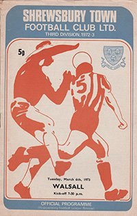 Match: Shrewsbury Town v Walsall Competition: League Division 3 Date: 06-03-1973 Comments: Rating: 3 Condition: Small split on top of spine,frayed edge on back page, slight foxing Weight in grams: 40