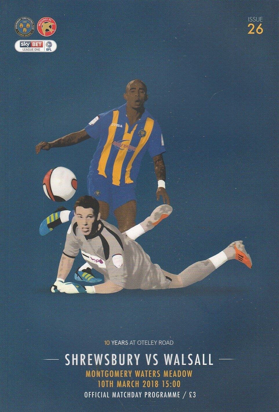 Match: Shrewsbury Town v Walsall Competition: League 1 Date: 10-Mar-2018 Comments: Rating: 4 Condition: Very good Weight in grams: 200
