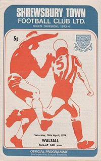 Match: Shrewsbury Town v Walsall Competition: League Division 3 Date: 20-04-1974 Comments: Rating: 4 Condition: Very good Weight in grams: 80