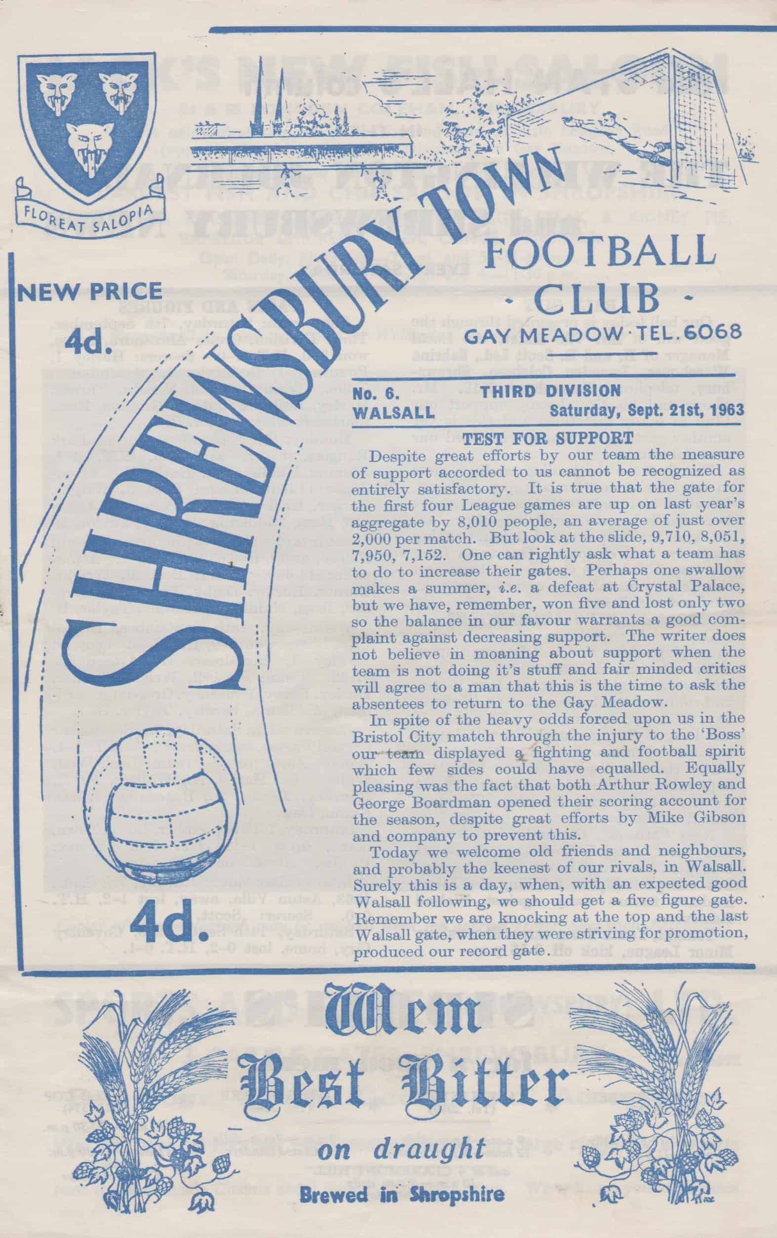Match: Shrewsbury Town v Walsall Competition: League Division 3 Date: 21-Sep-1963 Comments: Rating: 3 Condition: Team changes Weight in grams: 40