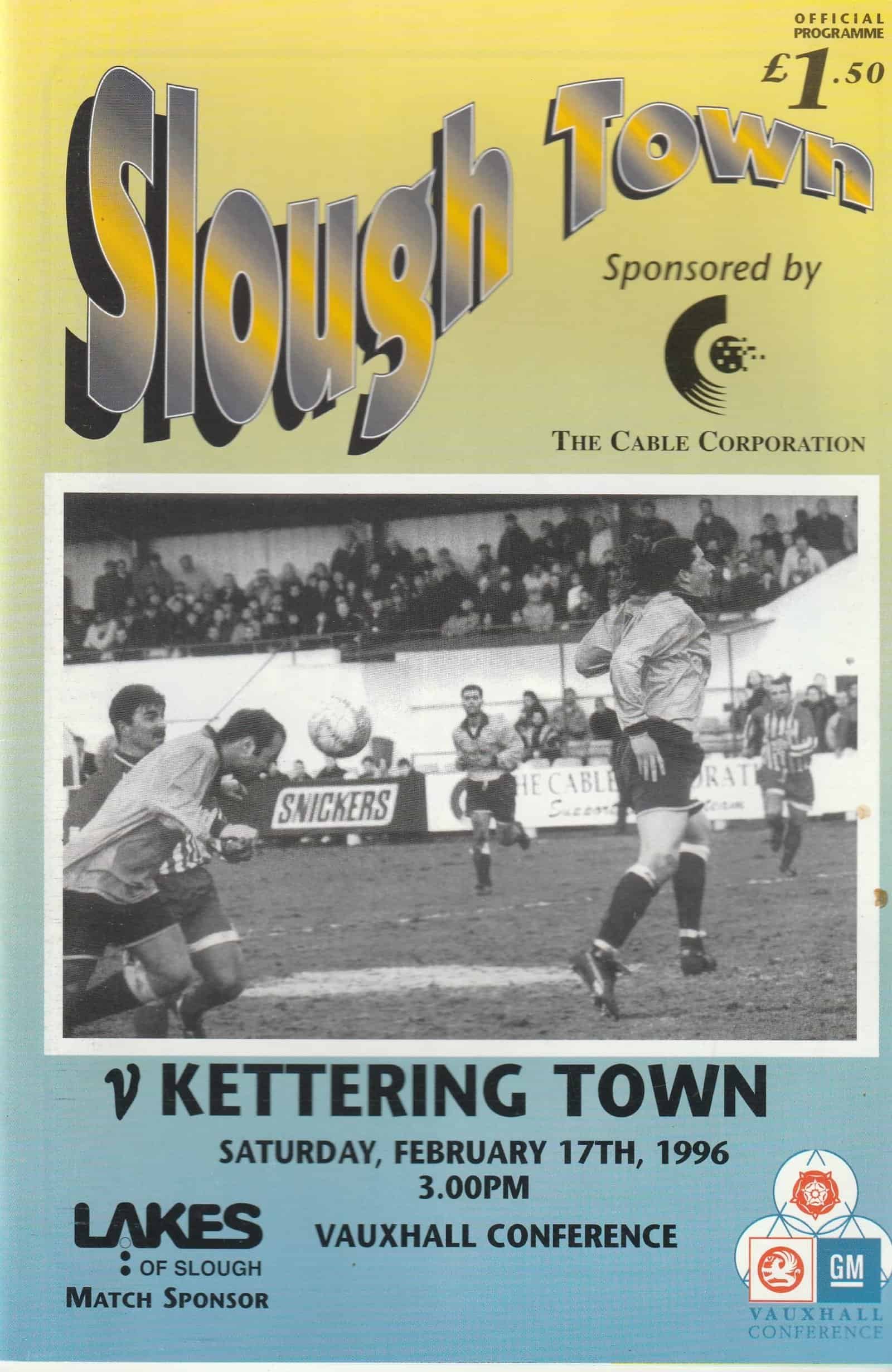 Match: Slough Town v Kettering Town Competition: GM Vauxhall Conference Date: 17-Feb-1996 Comments: Rating: 4 Condition: Very good Weight in grams: 140