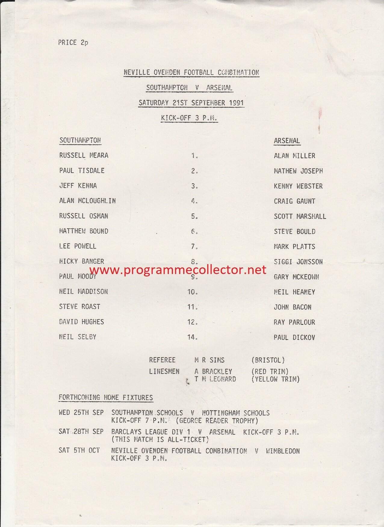 Match: Southampton Reserves v Arsenal Reserves Competition: Neville Ovenden Football Combination Date: 21-Sep-1991 Comments: Single sheet Rating: 3 Condition: Light folds Weight in grams: 10
