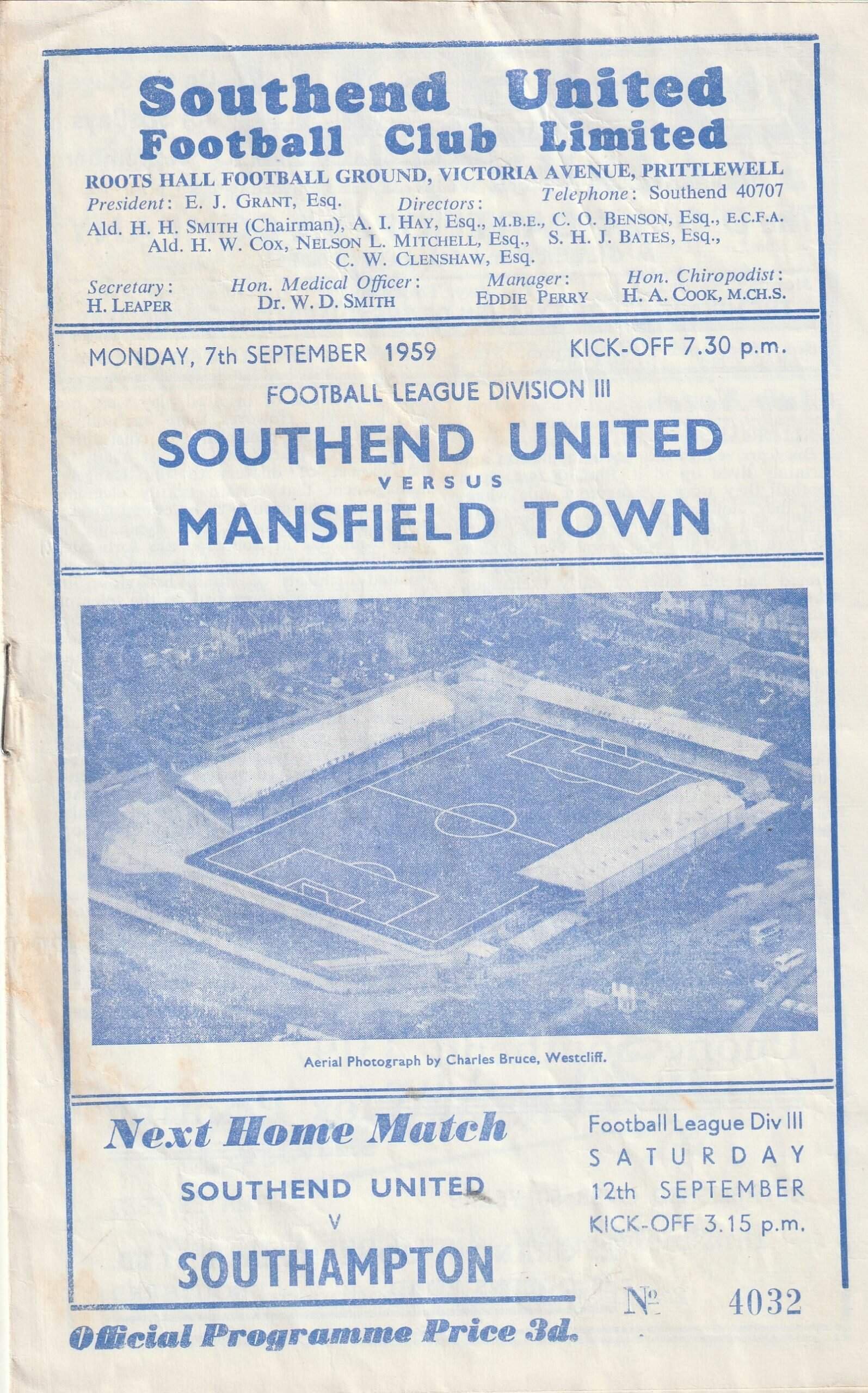 Match: Southend United v Mansfield Town Competition: League Division 3 Date: 07-09-1959 Comments: Rating: 3 Condition: Score listed on team line ups page, faint creasing, marks on cover Weight in grams: 40