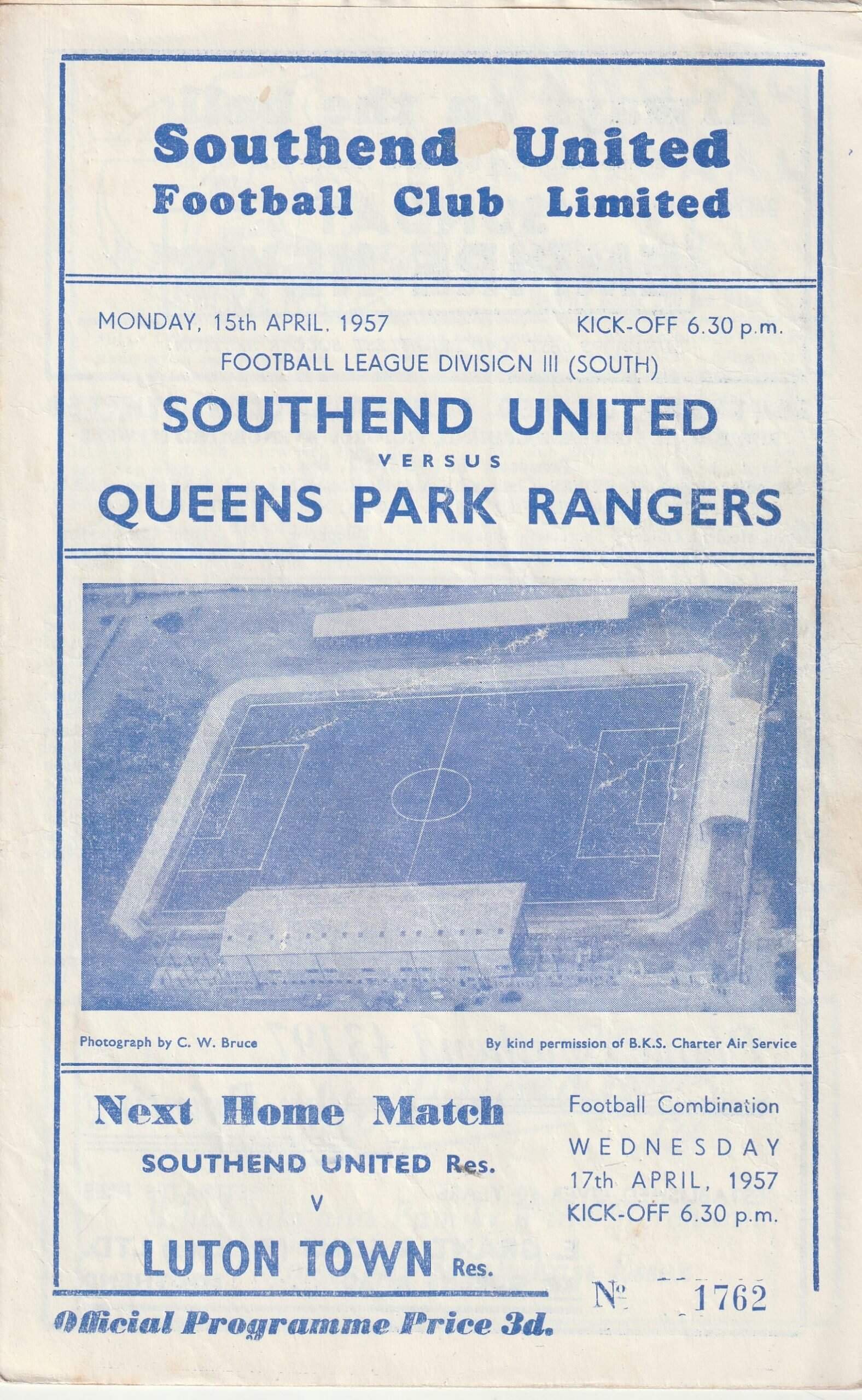 Match: Southend United v Queens Park Rangers Competition: League Division 3 South Date: 15-Apr-1957 Comments: Rating: 3 Condition: Team changes, wear to edges of pages, corner fold, mark on cover Weight in grams: 40