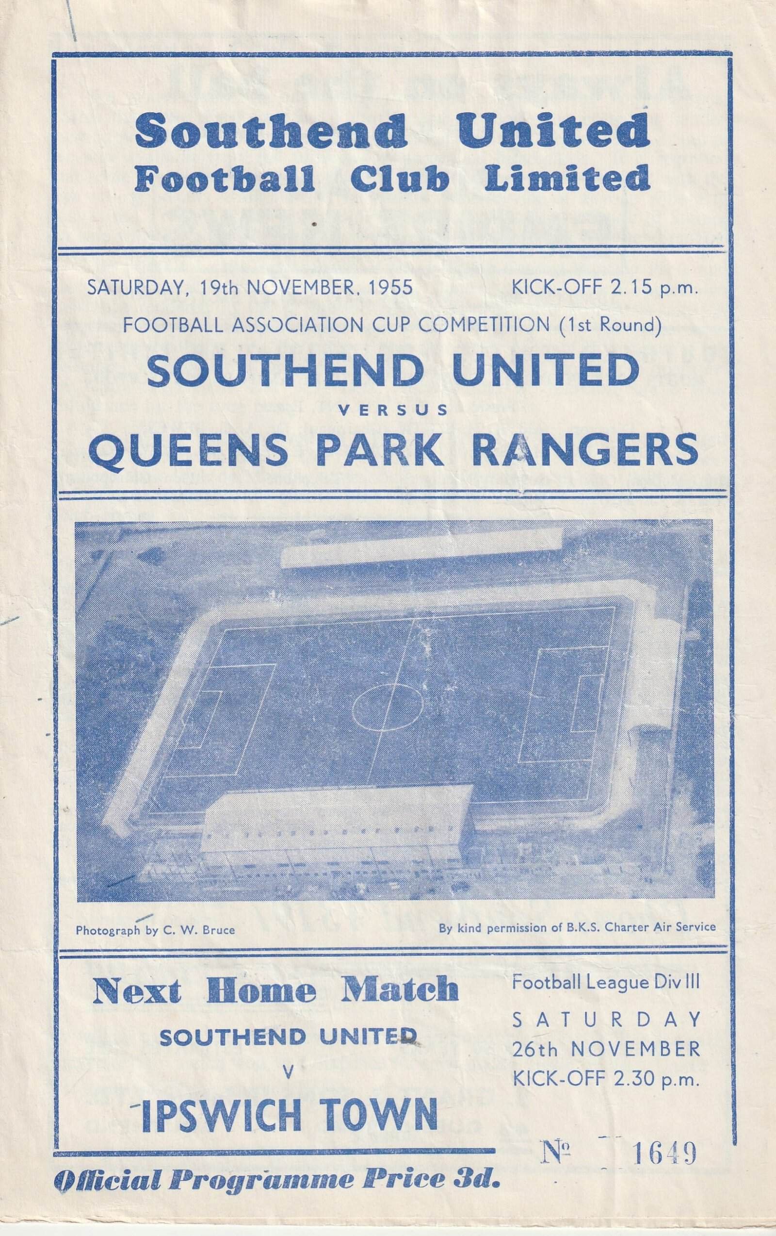 Match: Southend United v Queens Park Rangers Competition: FA Cup 1st Round Date: 19-Nov-1955 Comments: Rating: 3 Condition: Slight fold, score filled in on team line ups page and half time scorecard on back page Weight in grams: 40