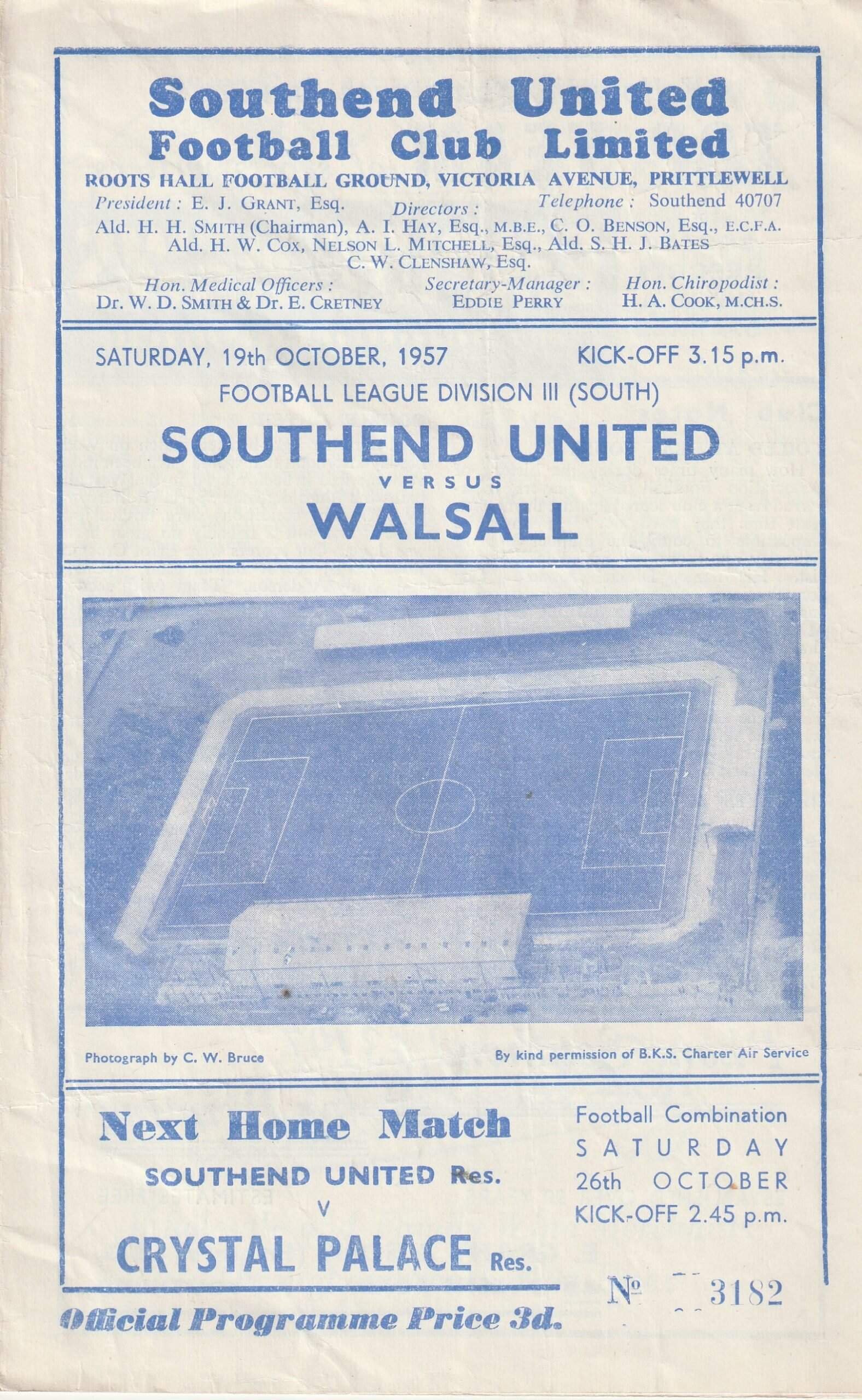 Match: Southend United v Walsall Competition: League Division 3 South Date: 19-Oct-1957 Comments: Rating: 3 Condition: Score on team line ups page, light handling wear Weight in grams: 40