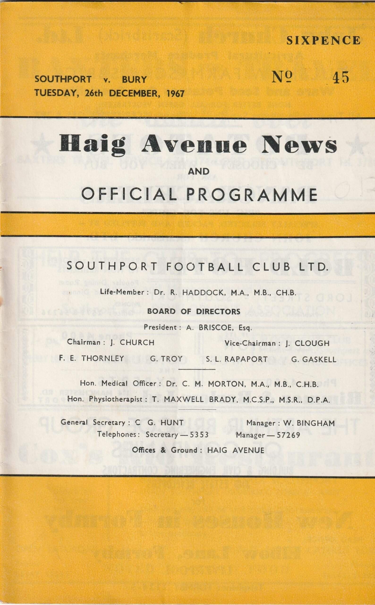 Match: Southport v Bury Competition: League Division 3 Date: 26-Dec-1967 Comments: Rating: 3 Condition: Fold Weight in grams: 80
