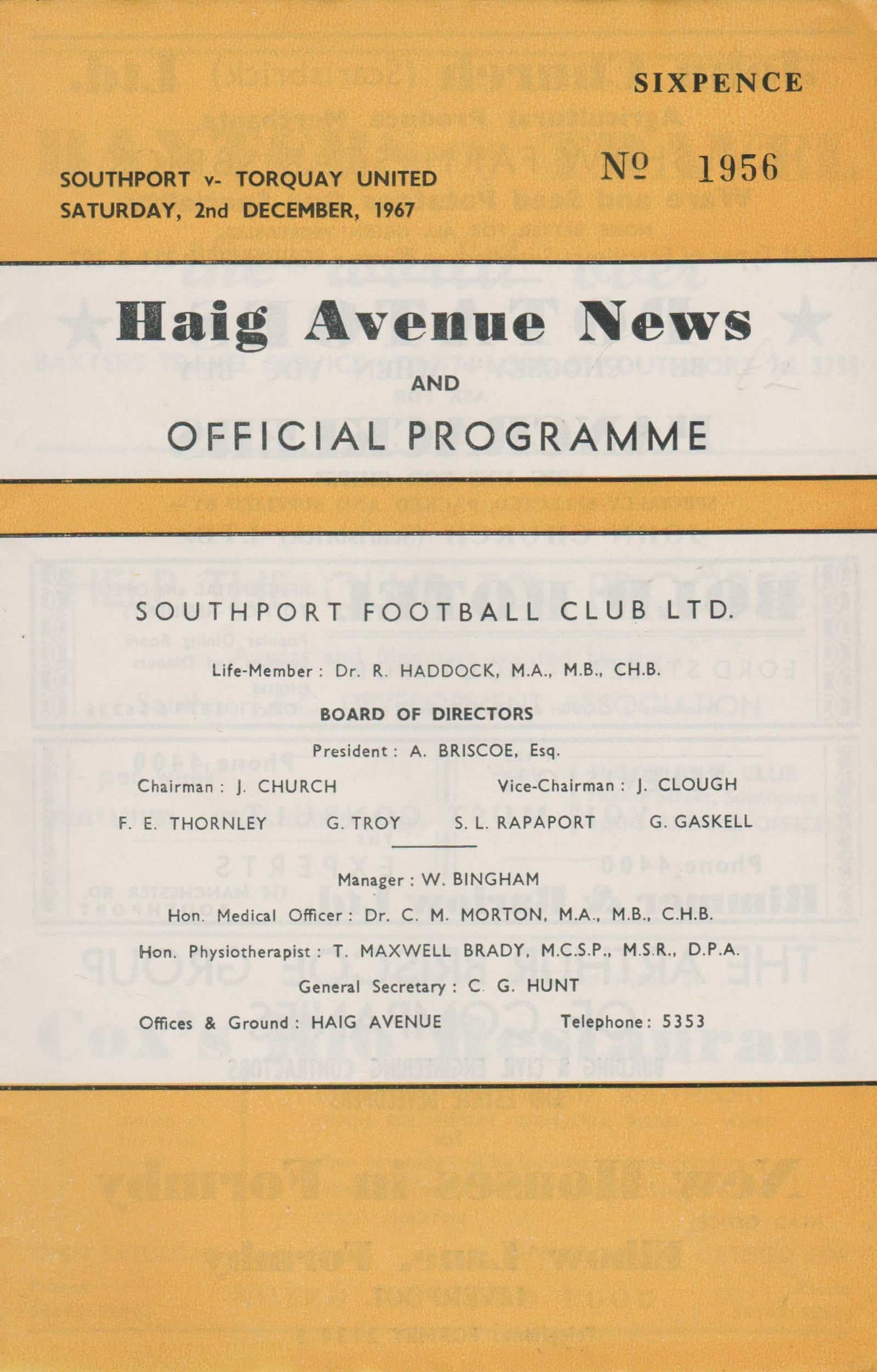 Match: Southport v Torquay United Competition: League Division 3 Date: 02-Dec-1967 Comments: Rating: 4 Condition: Very good Weight in grams: 60