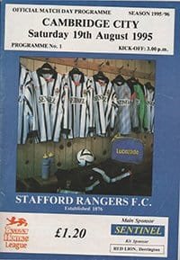 Match: Stafford Rangers v Cambridge City Competition: Beazer Homes League Premier Division Date: 19-08-1995 Comments: Rating: 3 Condition: Rusty staples, slight marks on face Weight in grams: 60