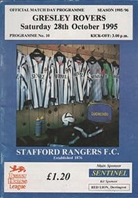 Match: Stafford Rangers v Gresley Rovers Competition: Beazer Homes League Premier Division Date: 28-10-1995 Comments: Rating: 3 Condition: Rusty staples, slight marks on face Weight in grams: 60