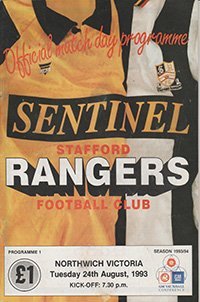Match: Stafford Rangers v Northwich Victoria Competition: GM Vauxhall Conference Date: 24-08-1993 Comments: Rating: 3 Condition: Mark on face, Print smudge on back, score inside Weight in grams: 100