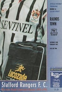 Match: Stafford Rangers v Raunds Town Competition: Dr Martens League Midland Division Date: 22-02-1997 Comments: Rating: 3 Condition: Good Weight in grams: 60